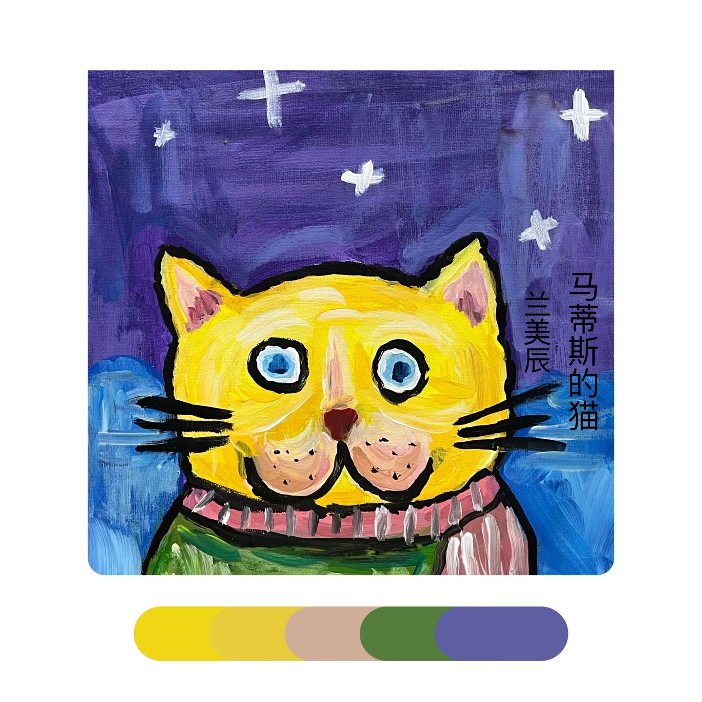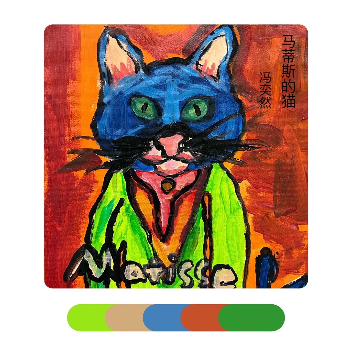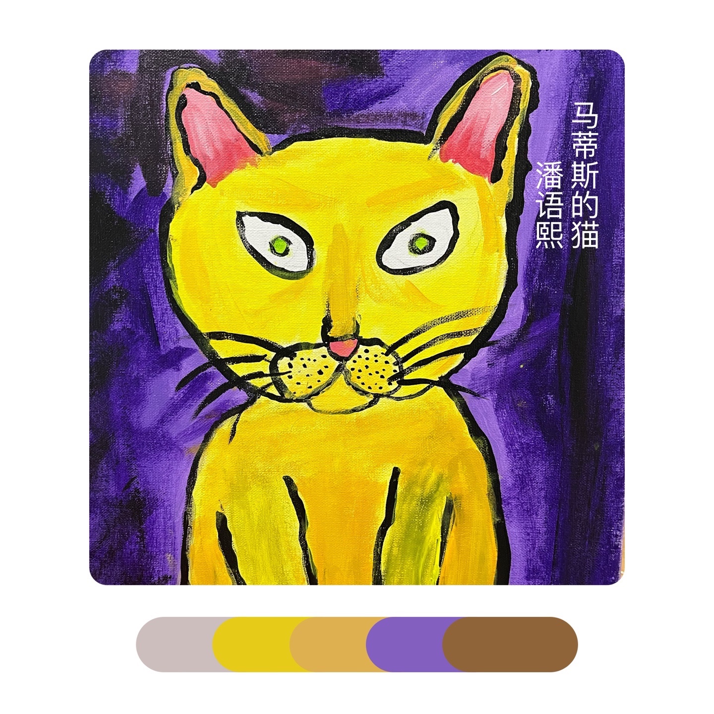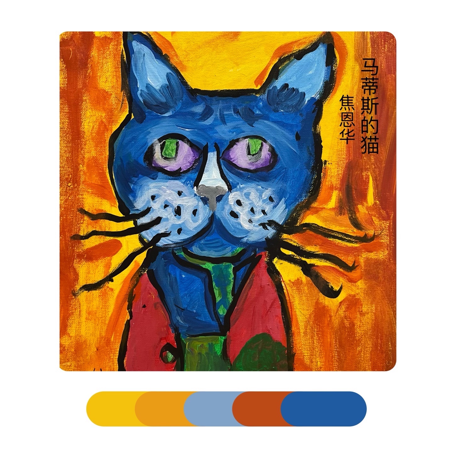 《马蒂斯的“猫”》马蒂斯大胆的、未经稀释的颜色和浓重的笔法进行创作。除此之外,马蒂斯在画画时经常用到互补色,比如红色与绿色、橙色与蓝色·····但是他的画法并没有得到当时人们的认可反而被取笑为“野兽”——讽刺的是,正是此评价给了这个不为人熟知的艺术派别一个新的名字——“野兽派”。感受马蒂斯绘画作品中的色彩,学习运用互补色来进行创作,以猫为主体进行大胆的创造,注意画面中的色彩的配比和点缀色的使用。