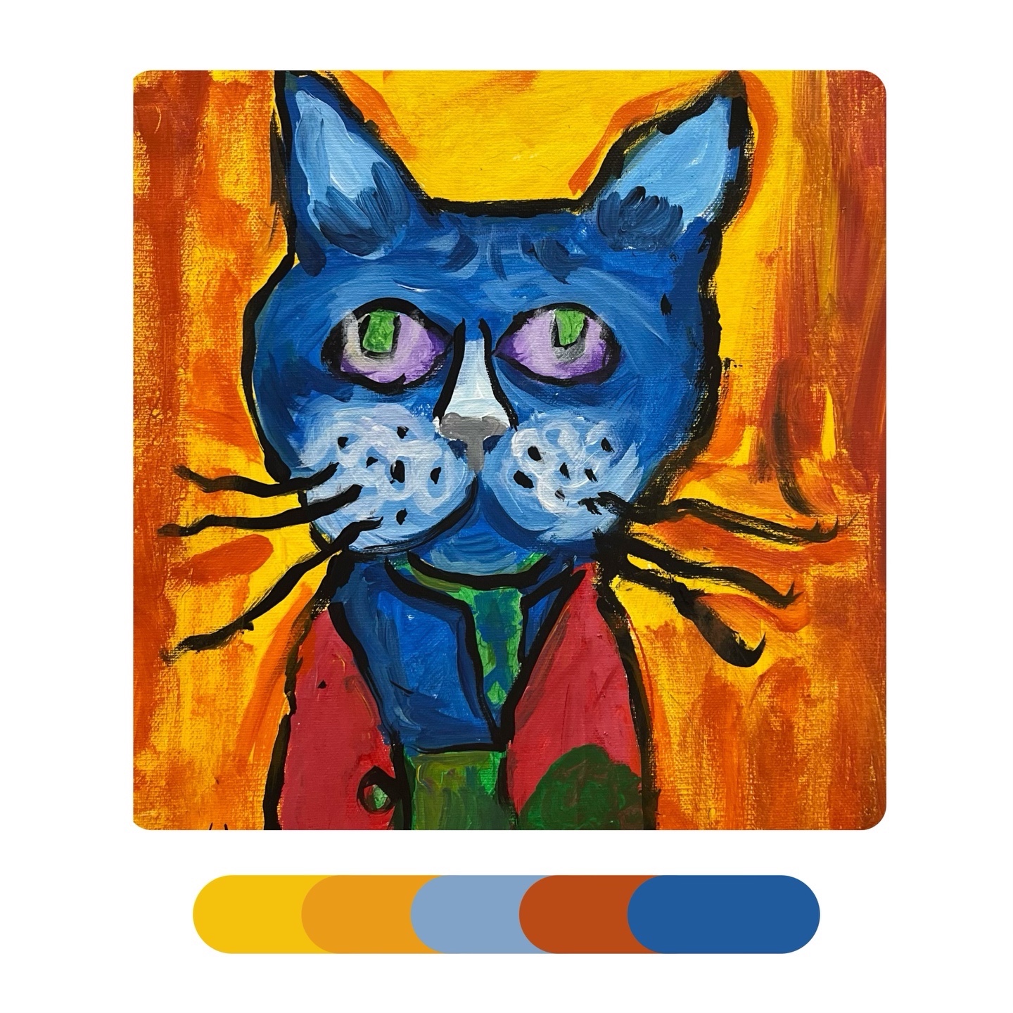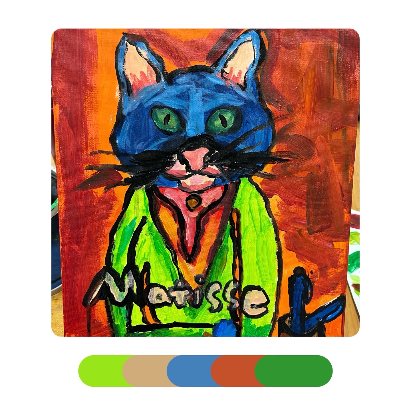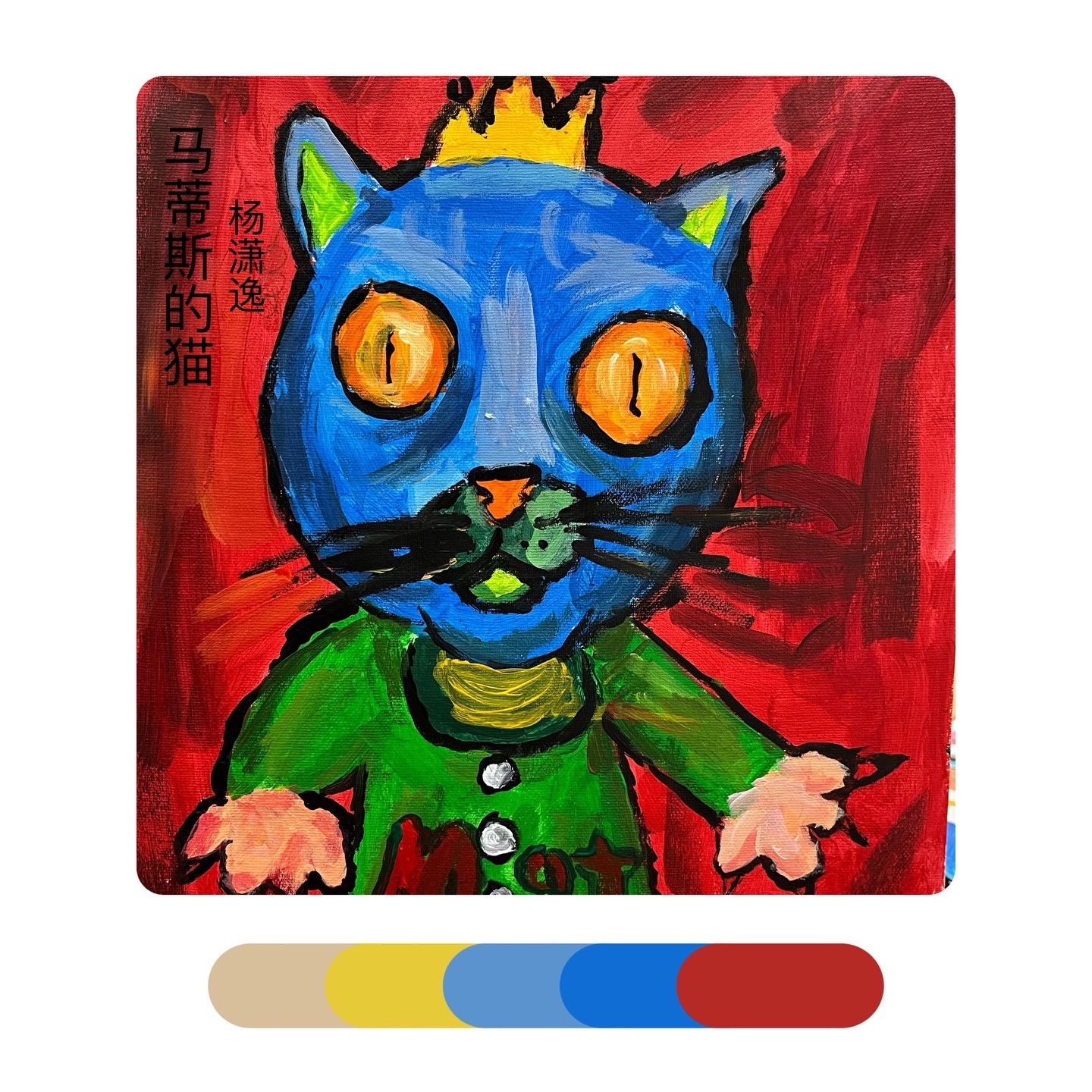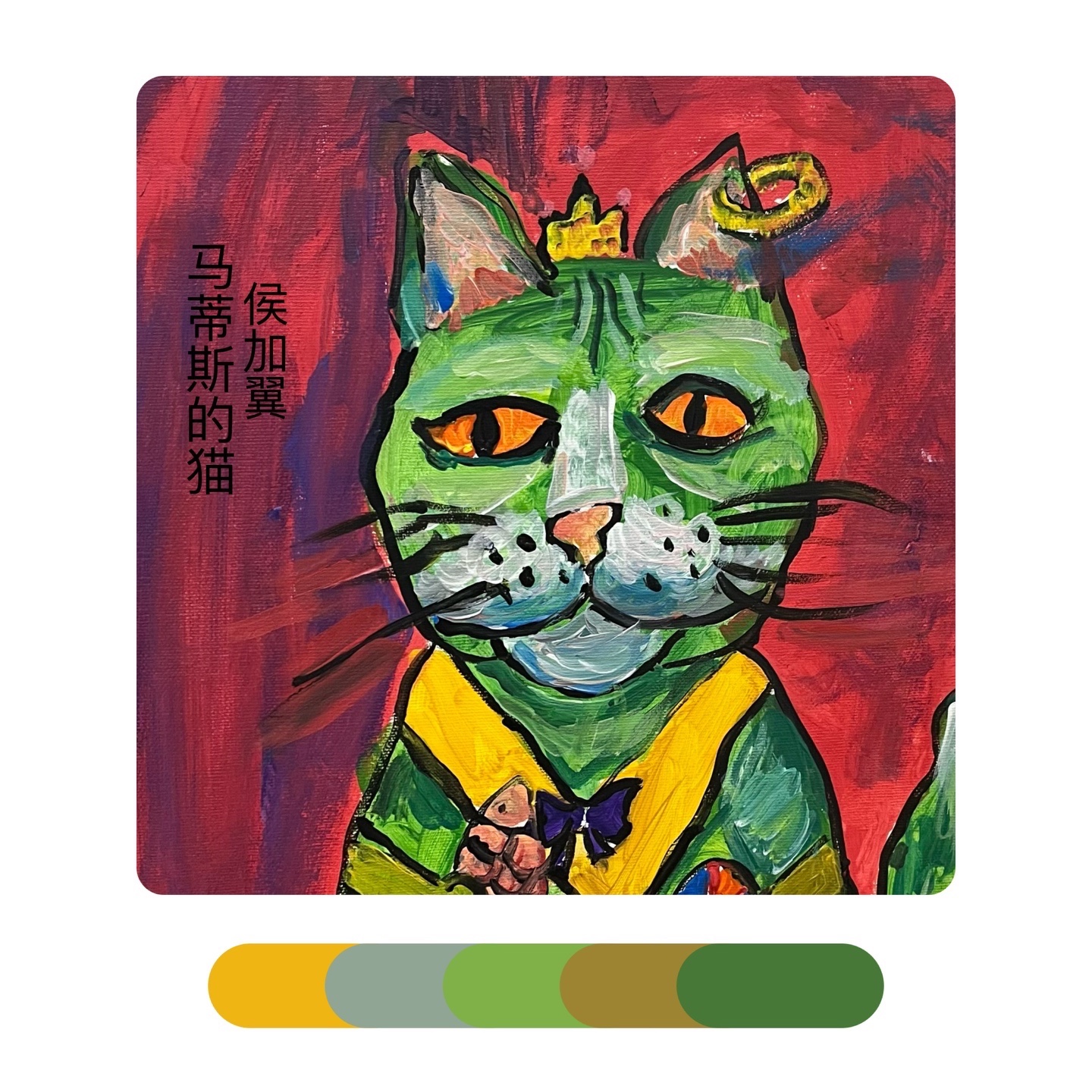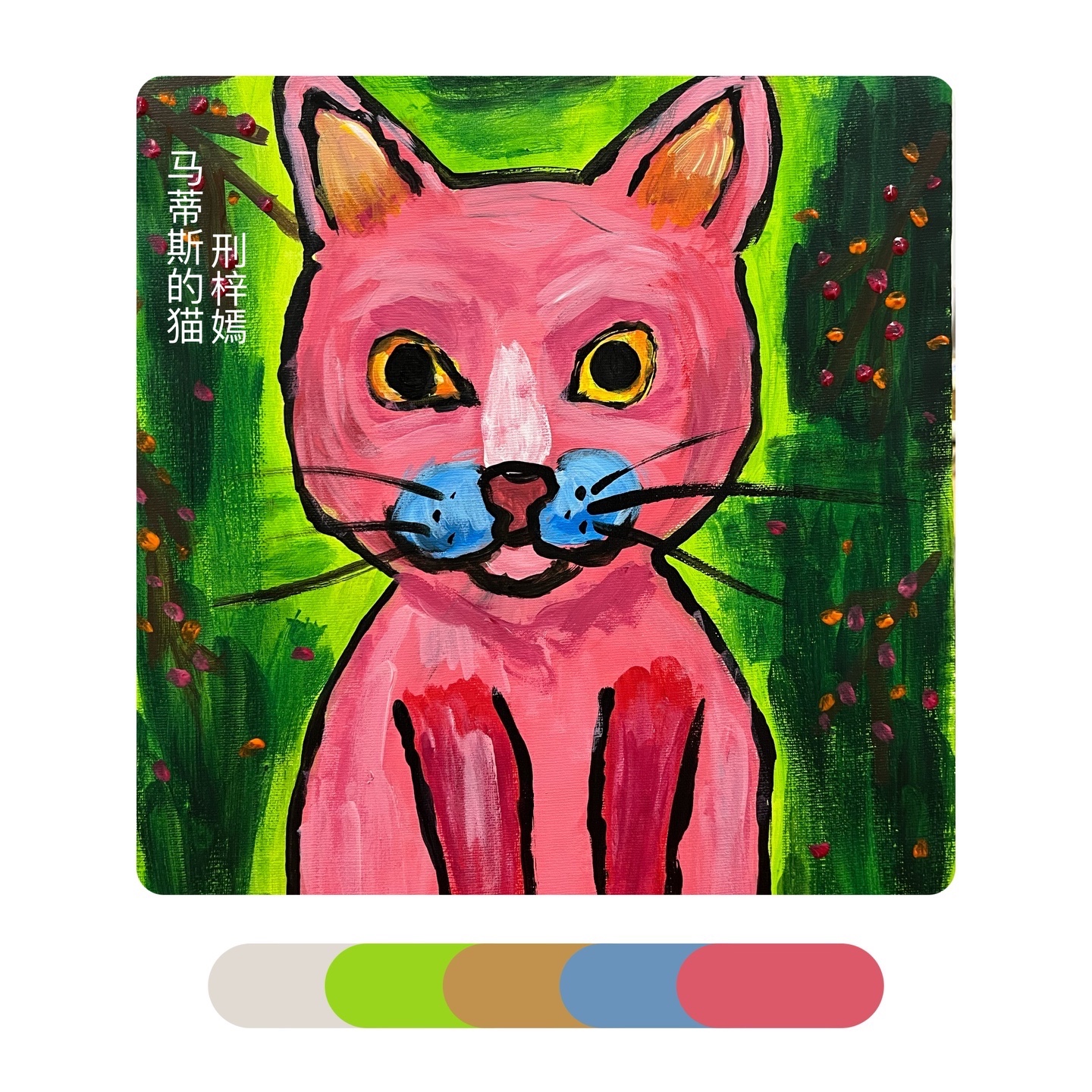 《马蒂斯的“猫”》马蒂斯大胆的、未经稀释的颜色和浓重的笔法进行创作。除此之外,马蒂斯在画画时经常用到互补色,比如红色与绿色、橙色与蓝色·····但是他的画法并没有得到当时人们的认可反而被取笑为“野兽”——讽刺的是,正是此评价给了这个不为人熟知的艺术派别一个新的名字——“野兽派”。感受马蒂斯绘画作品中的色彩,学习运用互补色来进行创作,以猫为主体进行大胆的创造,注意画面中的色彩的配比和点缀色的使用。
