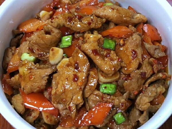 4.接着再倒入瘦肉一起翻炒,加入适量蚝油和白糖提鲜,继续翻炒均匀,炒至红椒断生入味,即可出锅开吃。