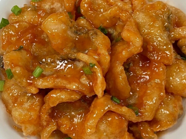 4.锅中留底油,继续加热后,倒入调好的糖醋酱汁焖煮,煮至汤汁浓稠后,倒入炸好的黑鱼片快速翻炒均匀,再撒入一把葱花点缀,即可出锅开吃。