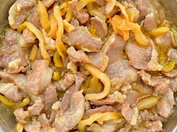 1.猪梅肉清洗干净,然后切成薄片,接着加入葱姜和适量的食盐、生抽、蚝油、白糖、玉米淀粉和花生油,一起抓拌均匀,腌制10分钟备用。