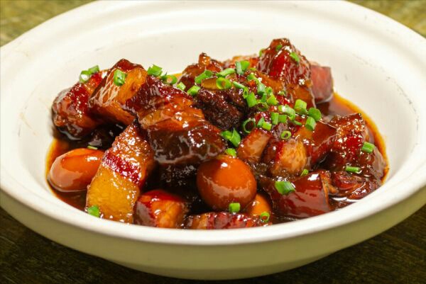 2、然后加葱姜蒜、香叶、八角、桂皮调味,淋入红烧酱油上色,添上开水没过猪肉,大火烧开,小火慢炖。炖到猪肉软烂,来一点盐,然后开大火收汁,待汤汁浓郁以后,就可以出锅了。