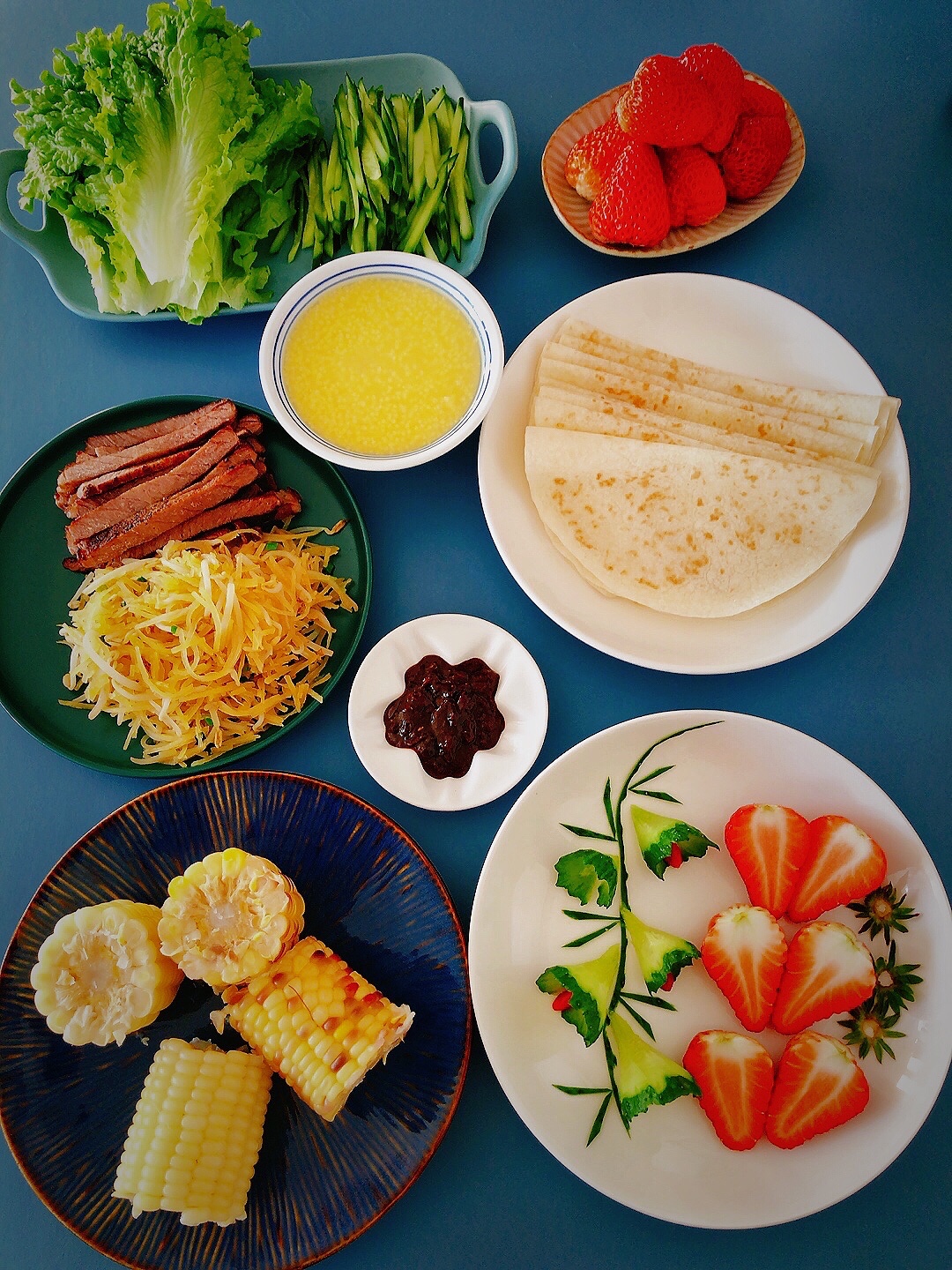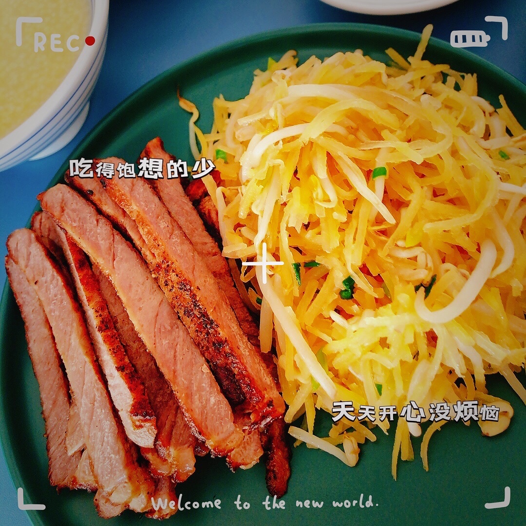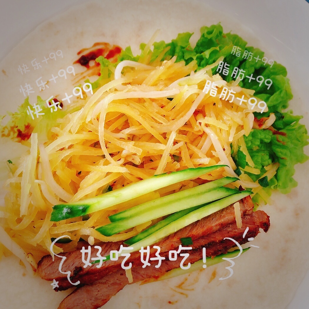 对猪头肉不感兴趣,把猪头肉换成牛排是很不错滴,土豆丝少了豆芽,貌似就少了一点灵魂,于是春饼搞起来,一个春饼摆了一桌子的配菜🤣🤣🤣