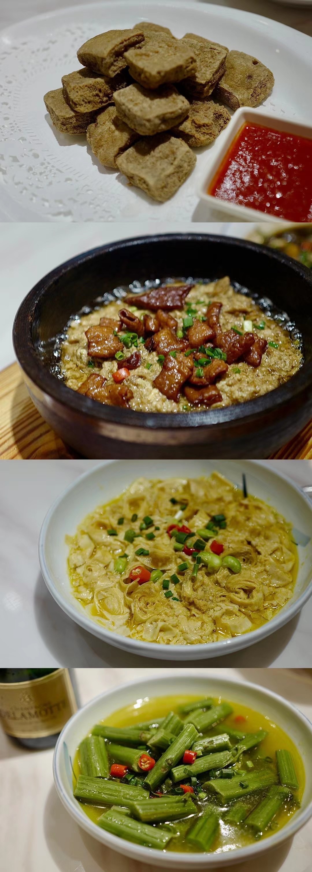 什么叫好客?一谈腌酱,我们一行头顶悬着大户人家的余粮,立刻,沙地土豆、芋艿、腐皮轮番做高级垫底。一惦记臭的,臭豆腐煲大肠、炸臭豆、臭菜梗,连霉千张也来了。一提说吃碳水,年糕、炸酸奶糕、蒸米饭全上!