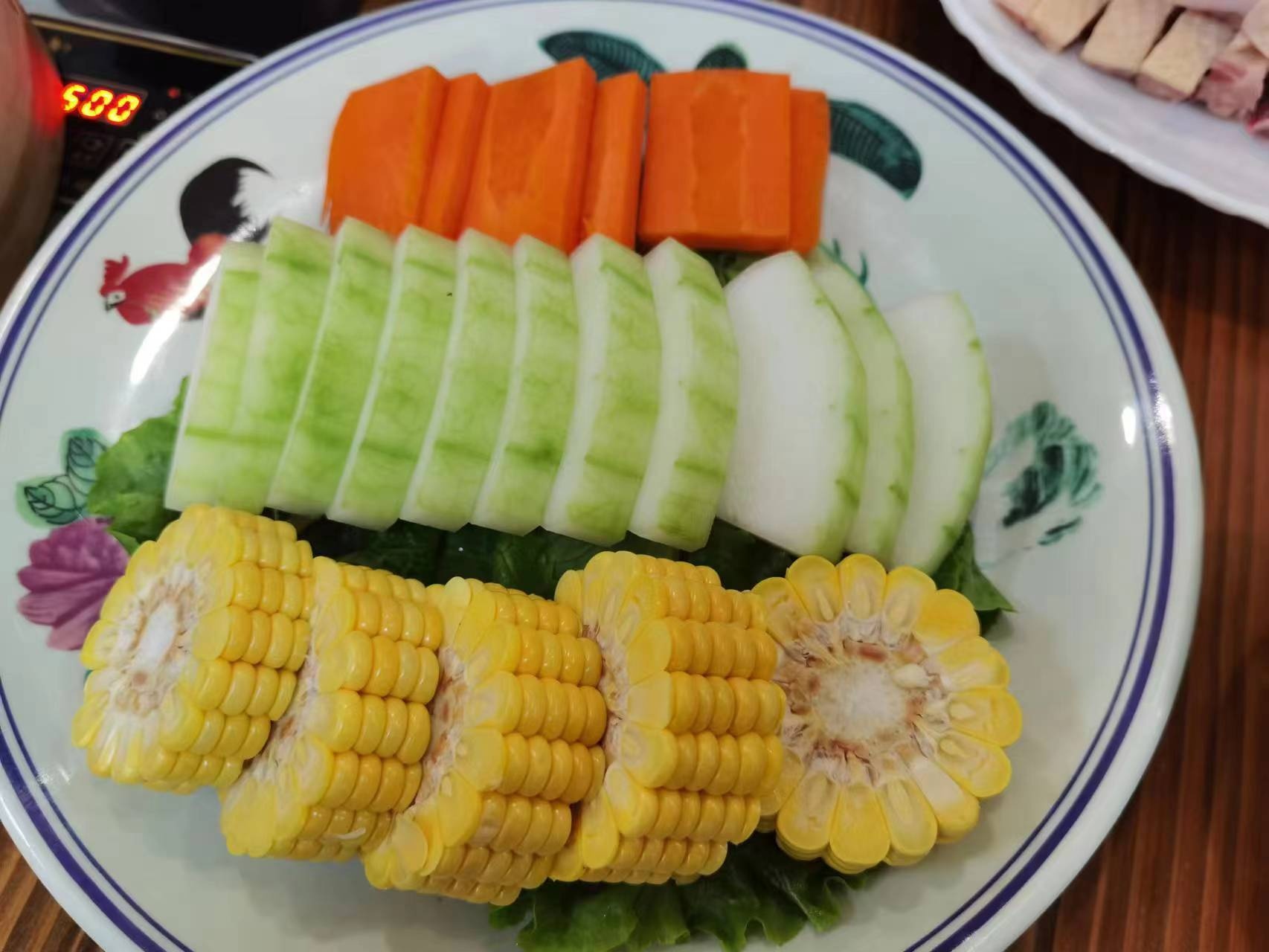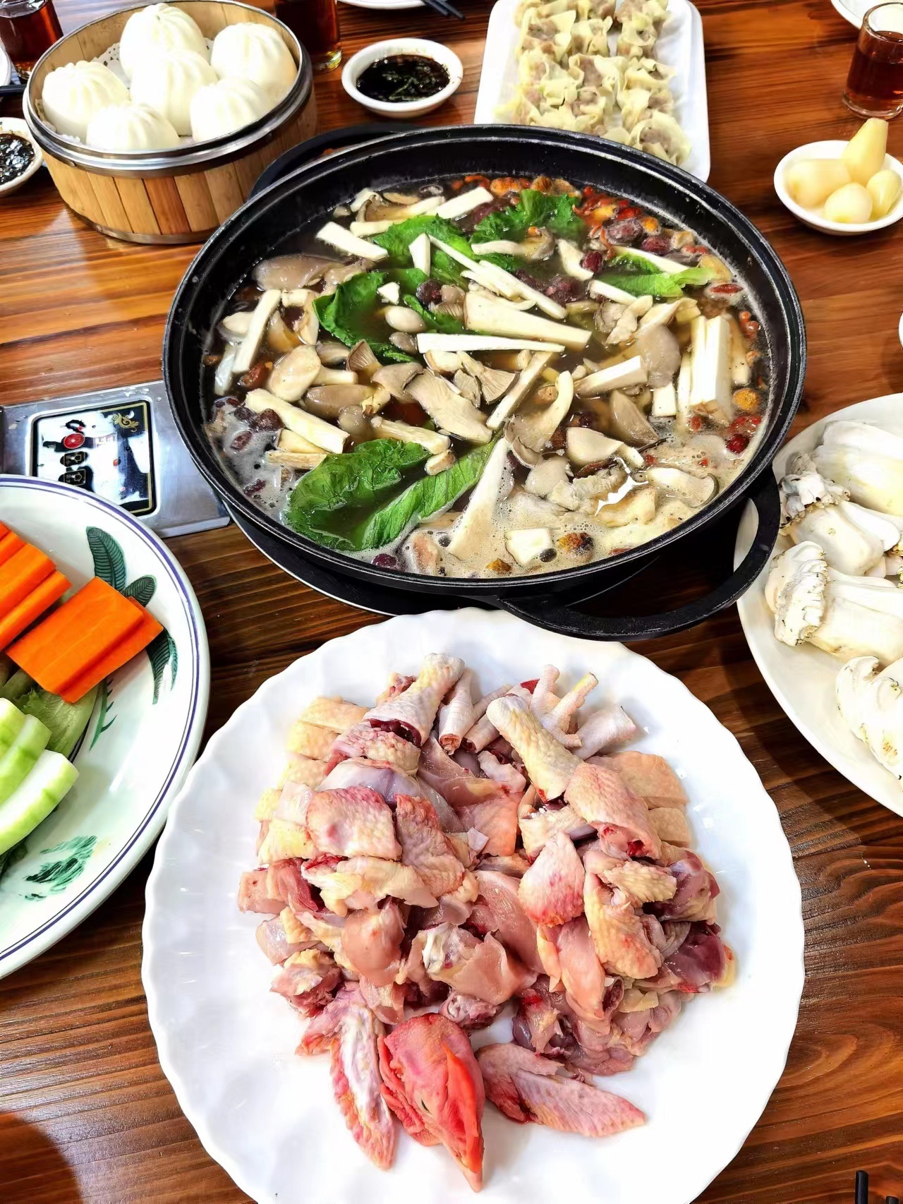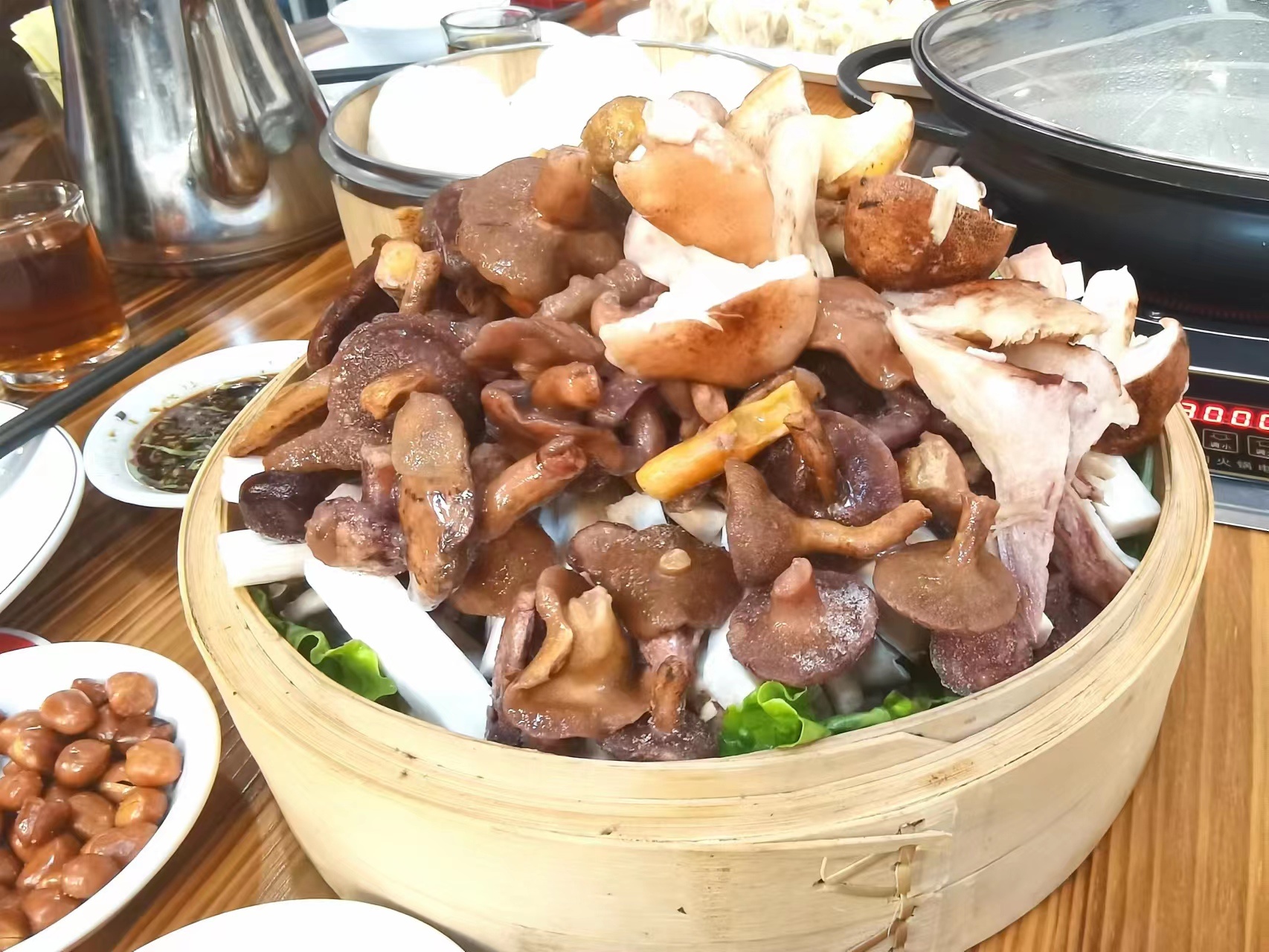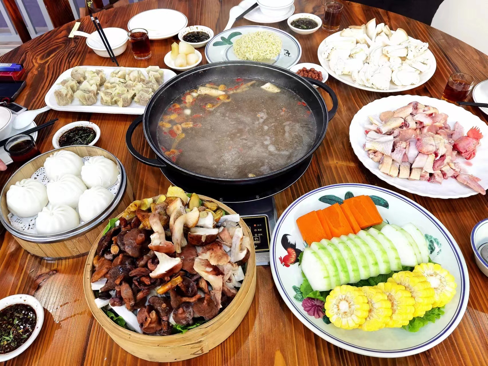 蔬菜拼盘:1份(三类),有鸡纵、平菇菌、鹿茸菌、鸡油菌等满满的一萝菌子,还配有小吃:烧卖1份、煎饺1份、千蒸1份、火锅面1份,吃得饱饱。