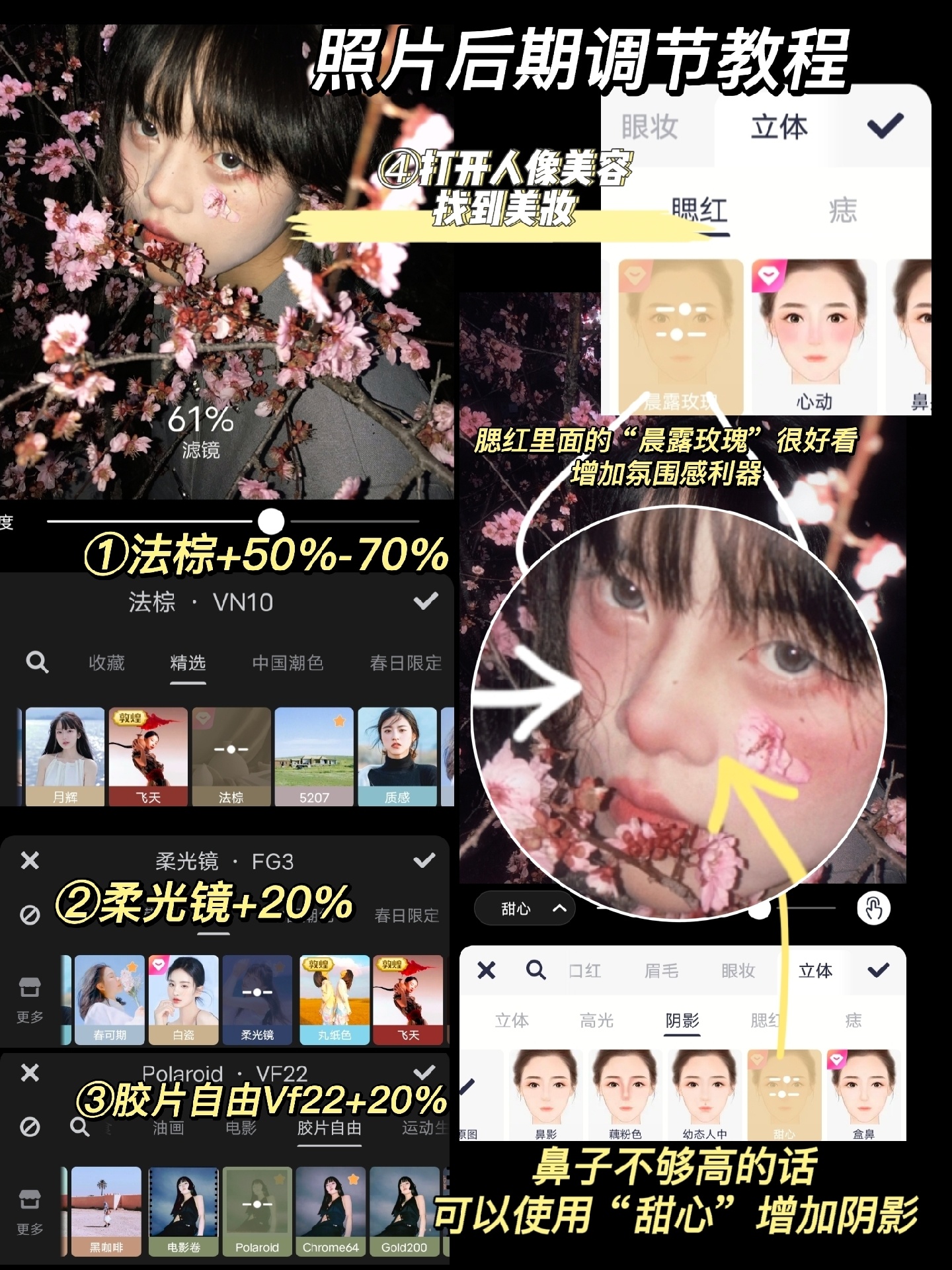 我拍照氛围感的秘诀是腮红 如果妆容化的很淡 可以使用软件补妆 教程在图上啦