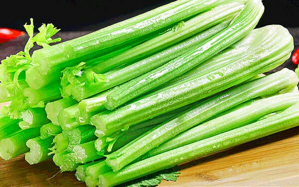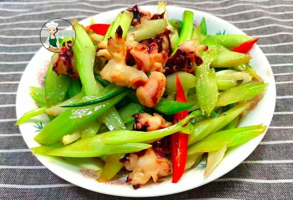 4、热锅凉油,下入大蒜炒香,加入西芹炒断生,下入鱿鱼须一起翻炒均匀,加入蚝油、盐调味,炒匀。