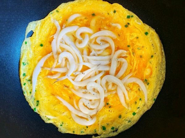 4、另起油锅,下入2勺花生油,油热后倒入蛋液,煎至半凝固状态,在上面放上银鱼,稍微铺均匀点,再轻轻翻炒一下,盛出装盘,撒上葱花,完成。