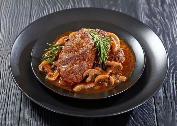 4、将煎好的牛排放在盘子中,倒上蘑菇汁即可食用。
