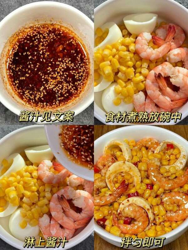 主要食材:虾仁,玉米粒,鸡蛋,白芝麻,蒜末,小米辣,生抽,陈醋,蚝油,盐,这就是一道典型的减脂餐了,常年保持健身习惯的人肯定非常熟悉,并且吃过不少。