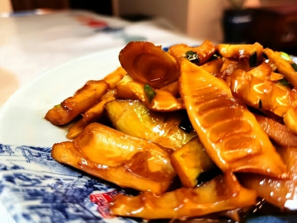 加入鲜笋、姜片和葱段,继续小火炖煮约半个小时,直到笋片变软且入味。