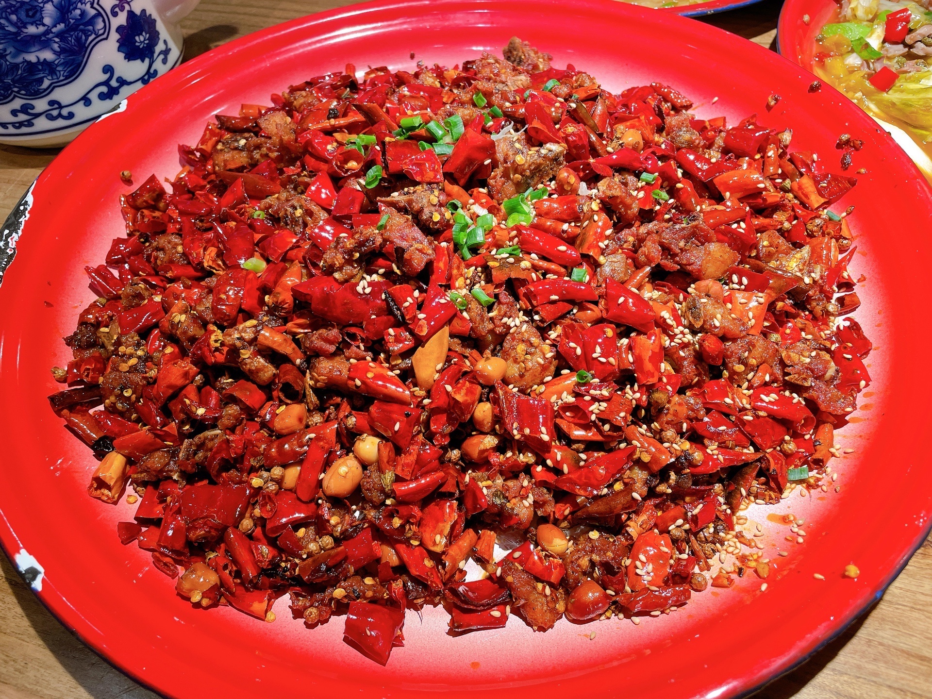 😄推荐一:辣子鸡,果然是招牌必点呀!刚上来一大 份,让人大吃- -惊哈哈哈,鸡肉像是炸过又配着辣椒爆炒的,香酥脆辣,实在过瘾