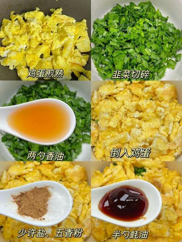 1、先把鸡蛋打成鸡蛋液下锅炒熟捞出,把韭菜切碎备用一起放碗里,加入2勺芝麻油,少许的盐和五香粉,最后来点蚝油,搅拌均匀成韭菜鸡蛋馅。
