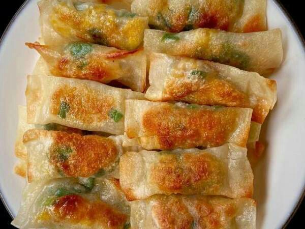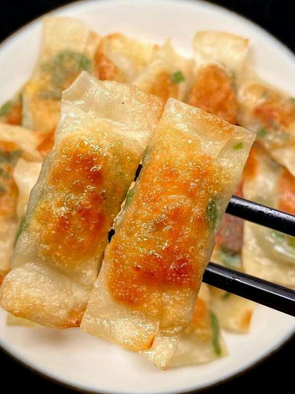 3、起锅烧油大约6成油温下入韭菜锅贴,全程中小火把锅贴煎至2面金黄,就可以开吃了,如果不想吃得太上火,可以煎至微微变黄后,淋上少许的水盖上盖子焖煮2-3分钟,里面的韭菜馅料刚刚好煮熟,云吞皮的不仅可以做云吞,还可以做虾饺,锅贴,春卷等小吃,况且做起来太简单了,家里常备点云吞皮,简直是懒人的福音。