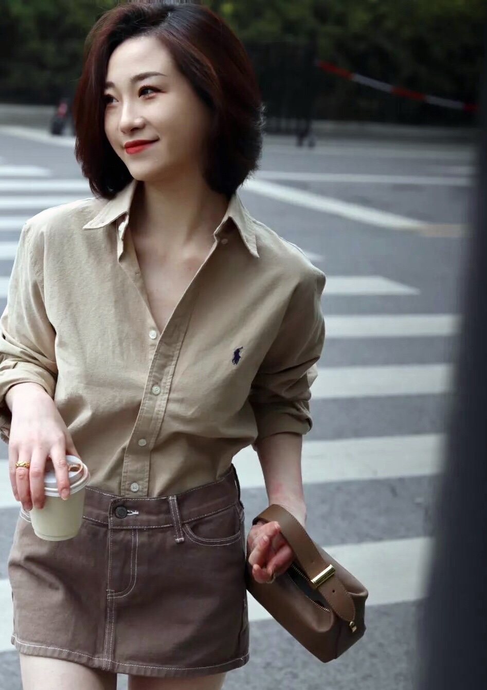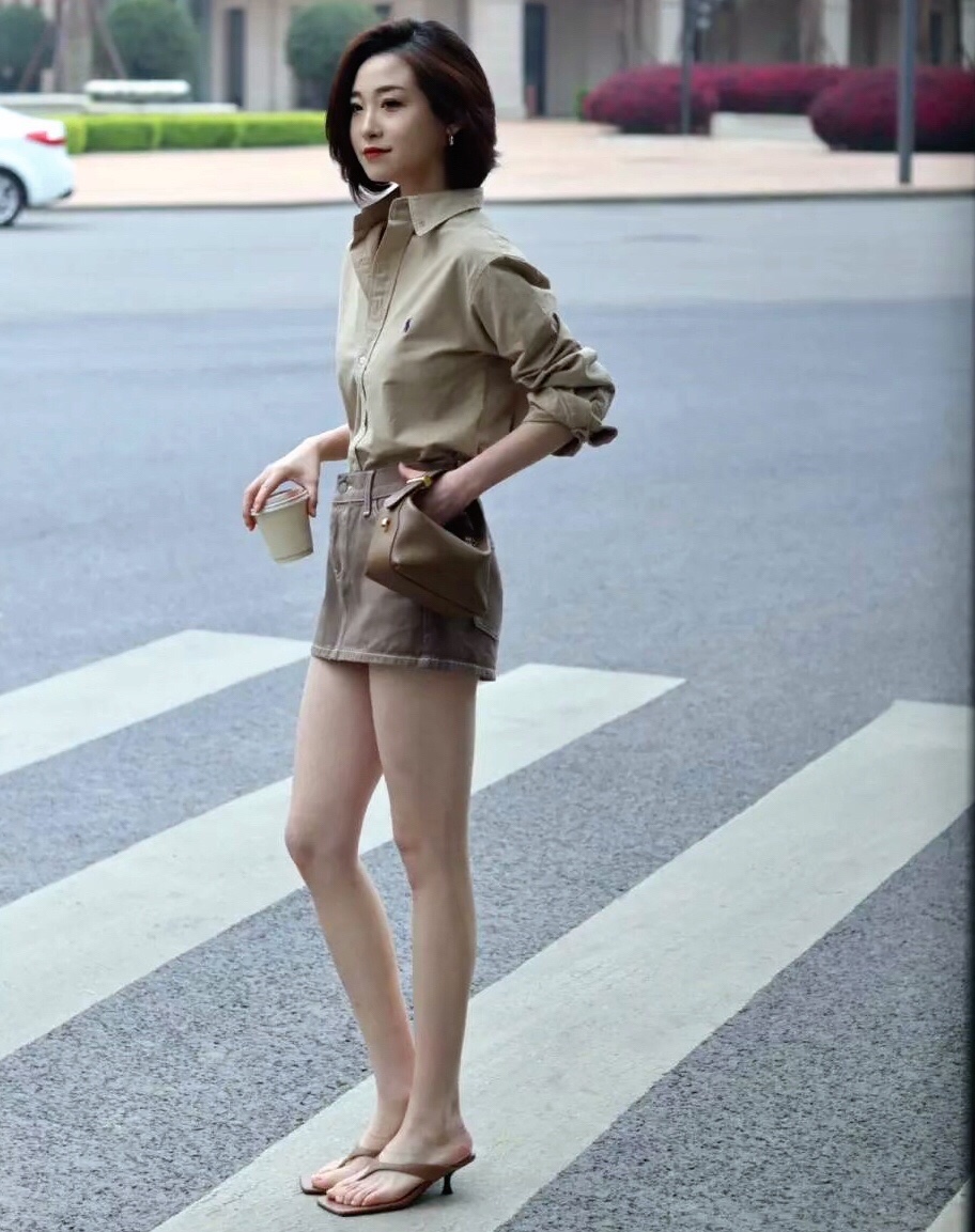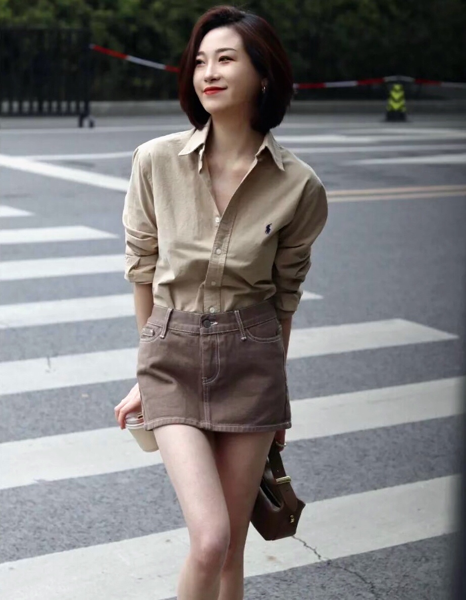 选择一件衬衫上衣搭配牛仔短裙,把衬衫扎进短裙里面提下腰线能很好的达到显瘦显高的效果~
