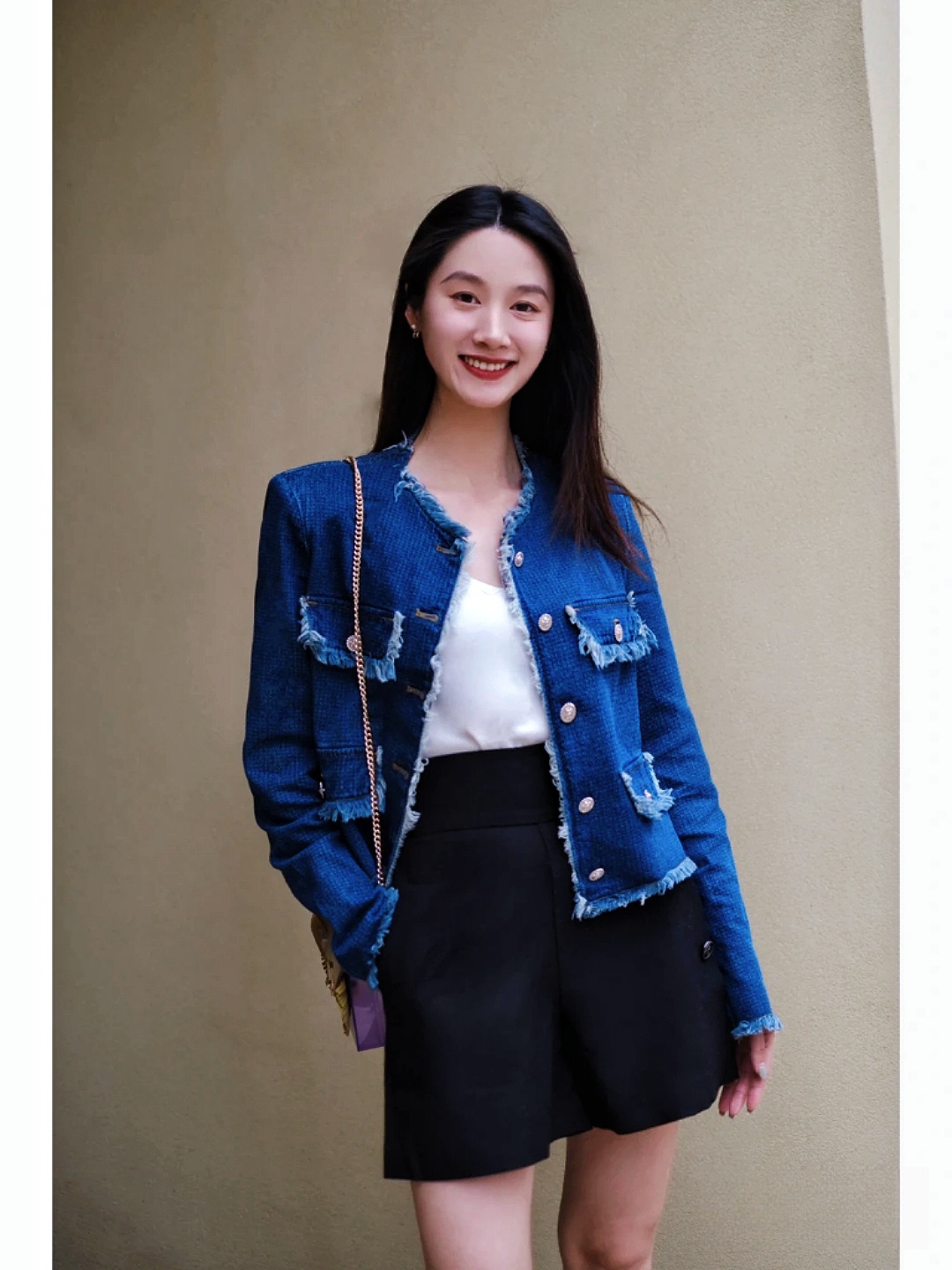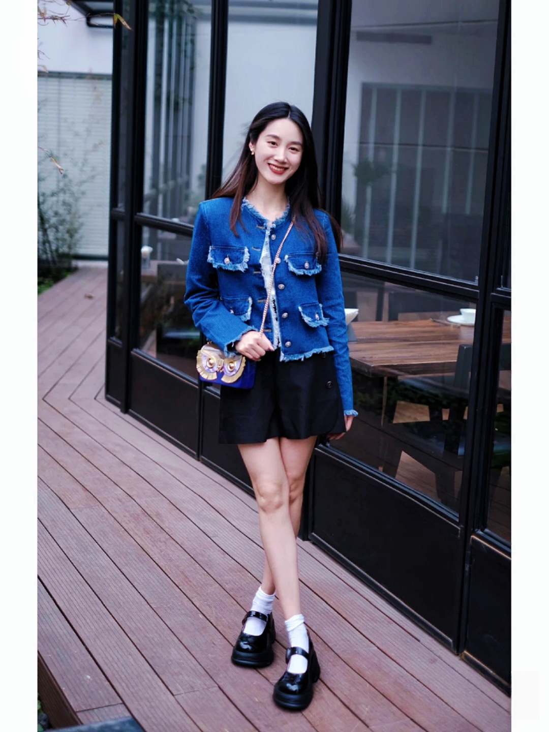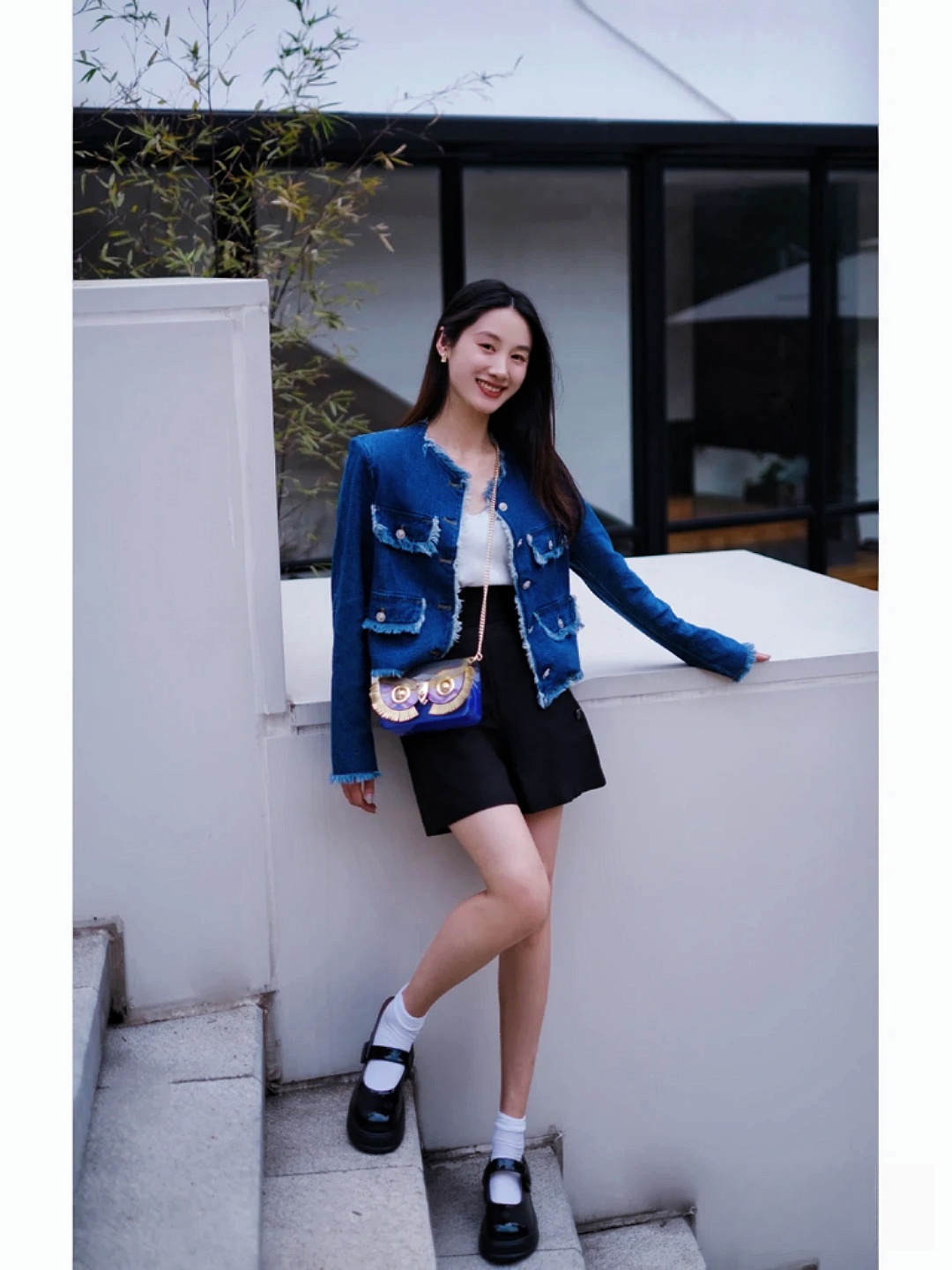 4k,8k,精细细节,超高分辨率,最佳质量,高清,复杂细节,大文件大小,令人惊叹,单反摄影,极端光影,景深,焦散,宽光,自然阴影,女孩,(85mm,f/ 1.4,iso 200,1/600:0.75),(复杂细节:1.1),复杂背景,,(复杂细节:1.12),,短裤,户外, 棕色头发, 珠宝, 衬衫, 棕色眼睛, 牛仔布, 项链, 长发, 粉红色衬衫, 牛仔短裤, 路, 单独聚焦, 街道, 建筑, 看着观众, 树, 人行横道, 微笑, 有领衬衫、短裤、白天、天空、嘴唇、站立、蓝色短裤、格子、牛仔射击、戒指、手腕袖口、耳环、蝴蝶结
