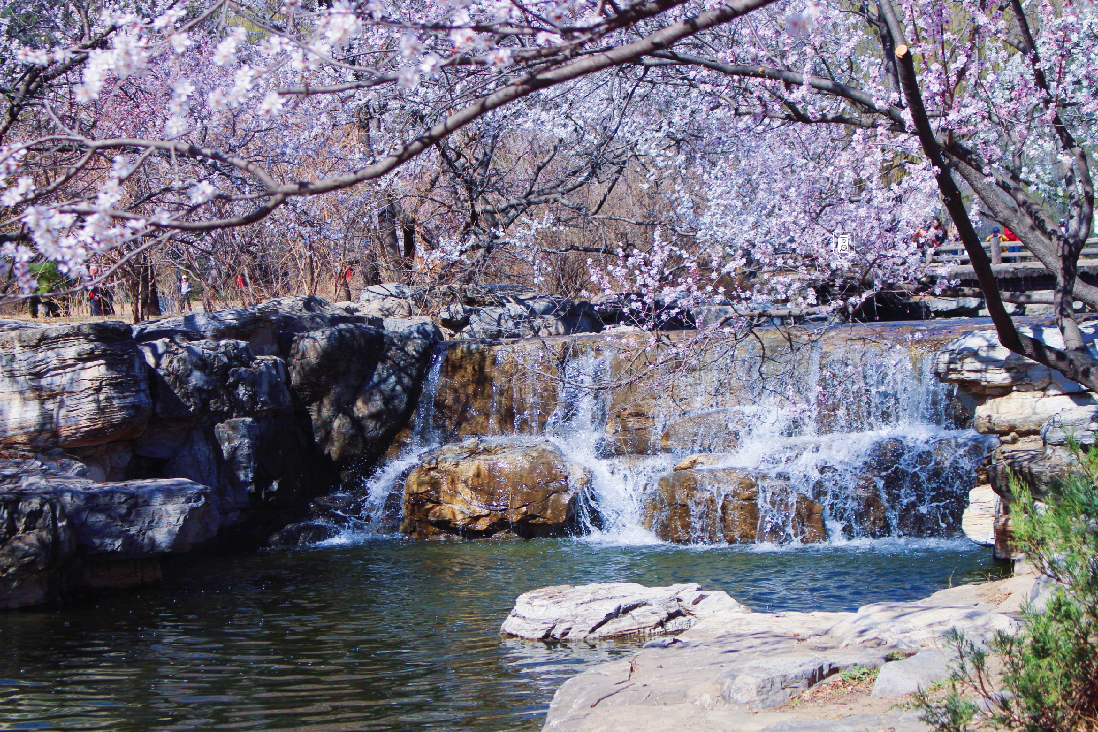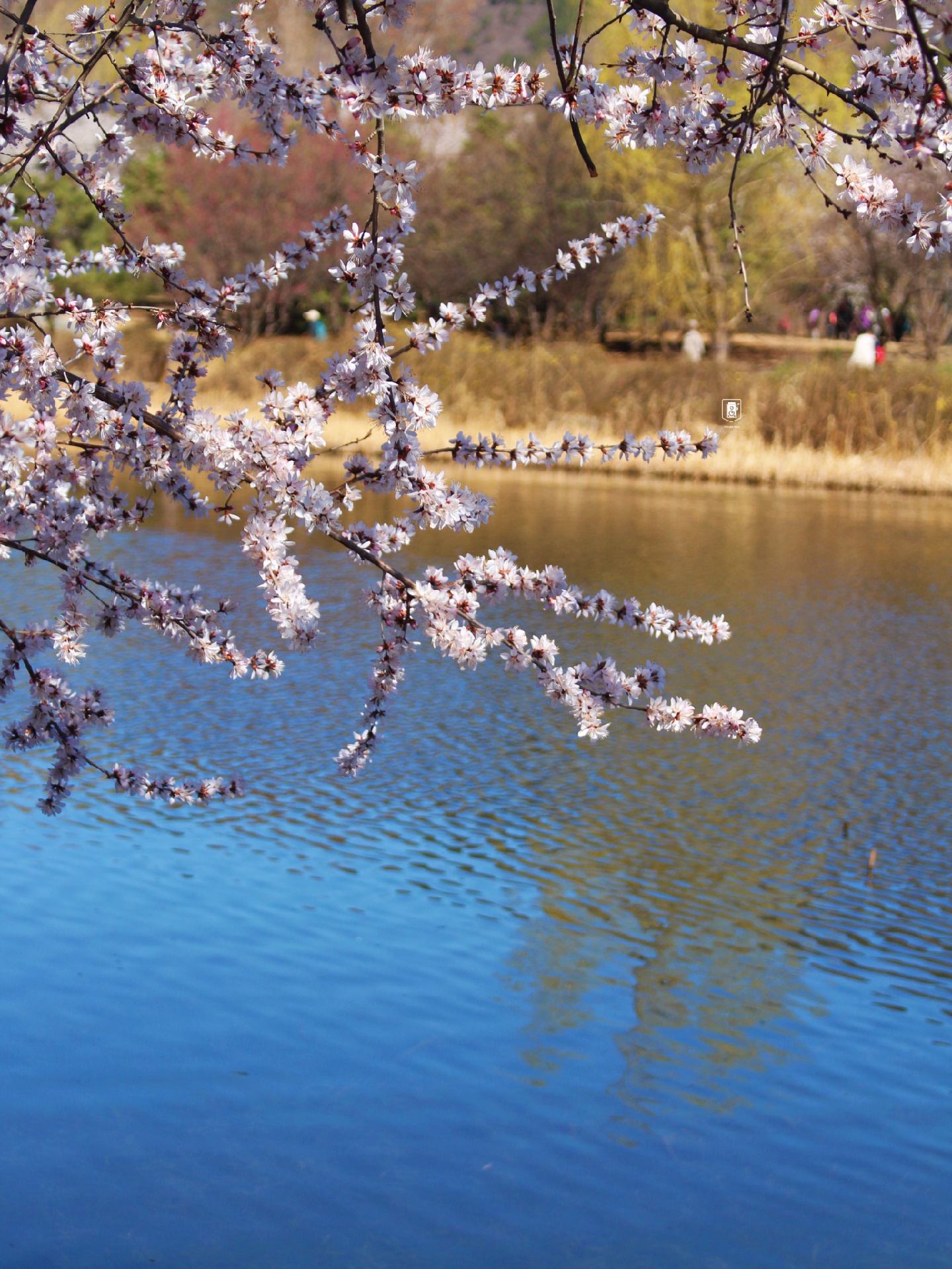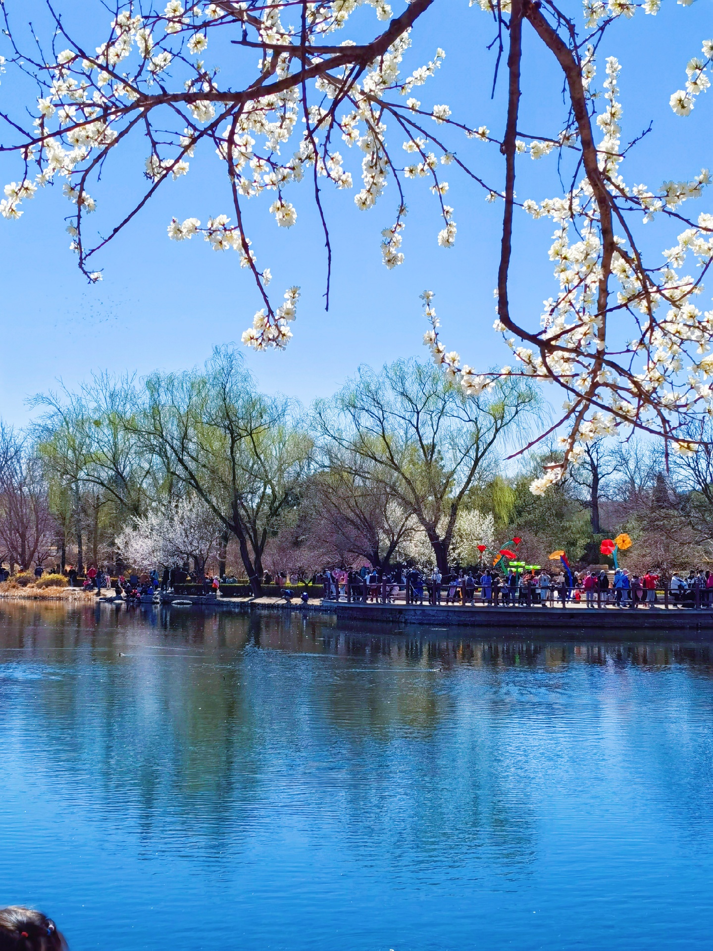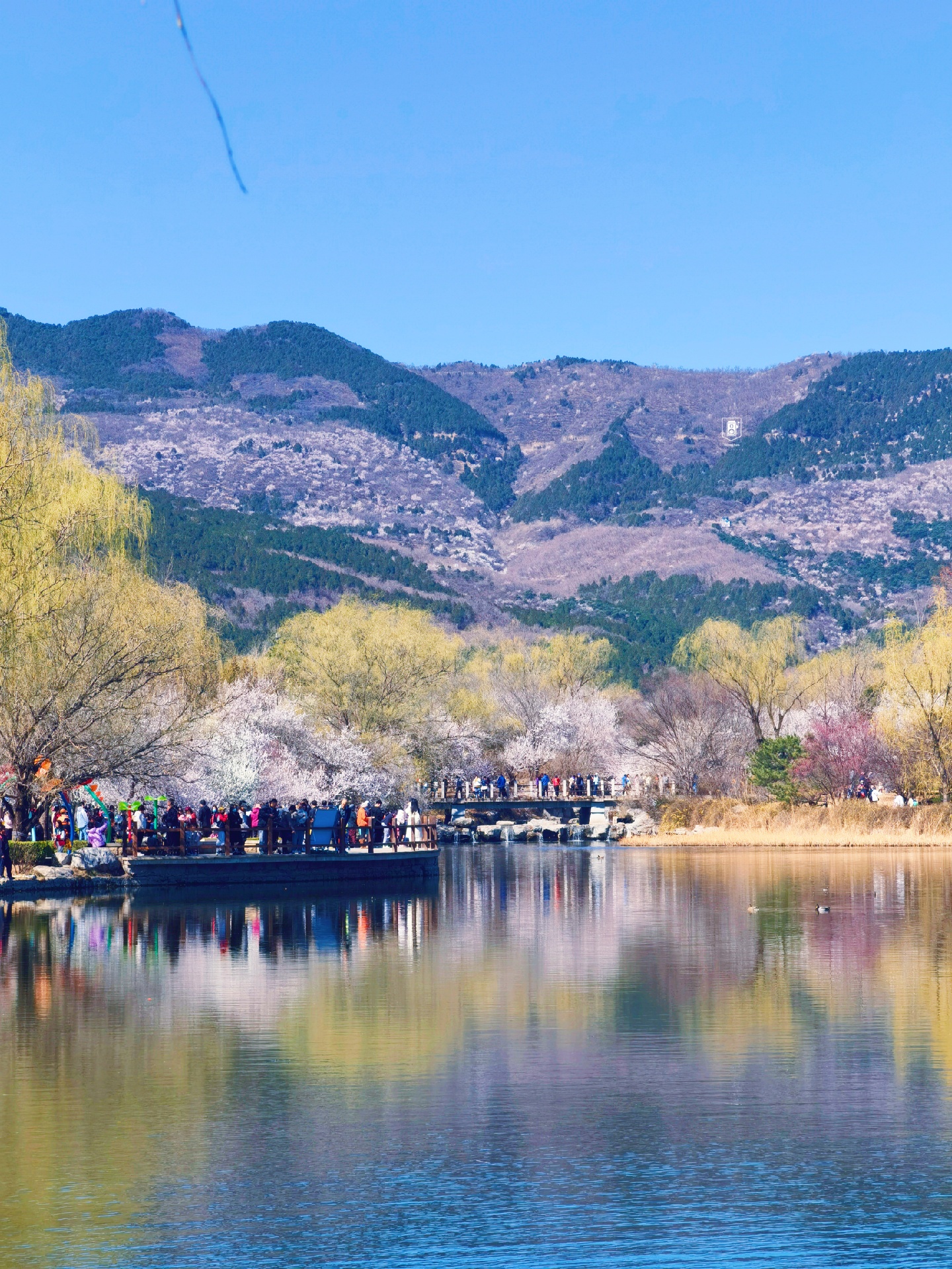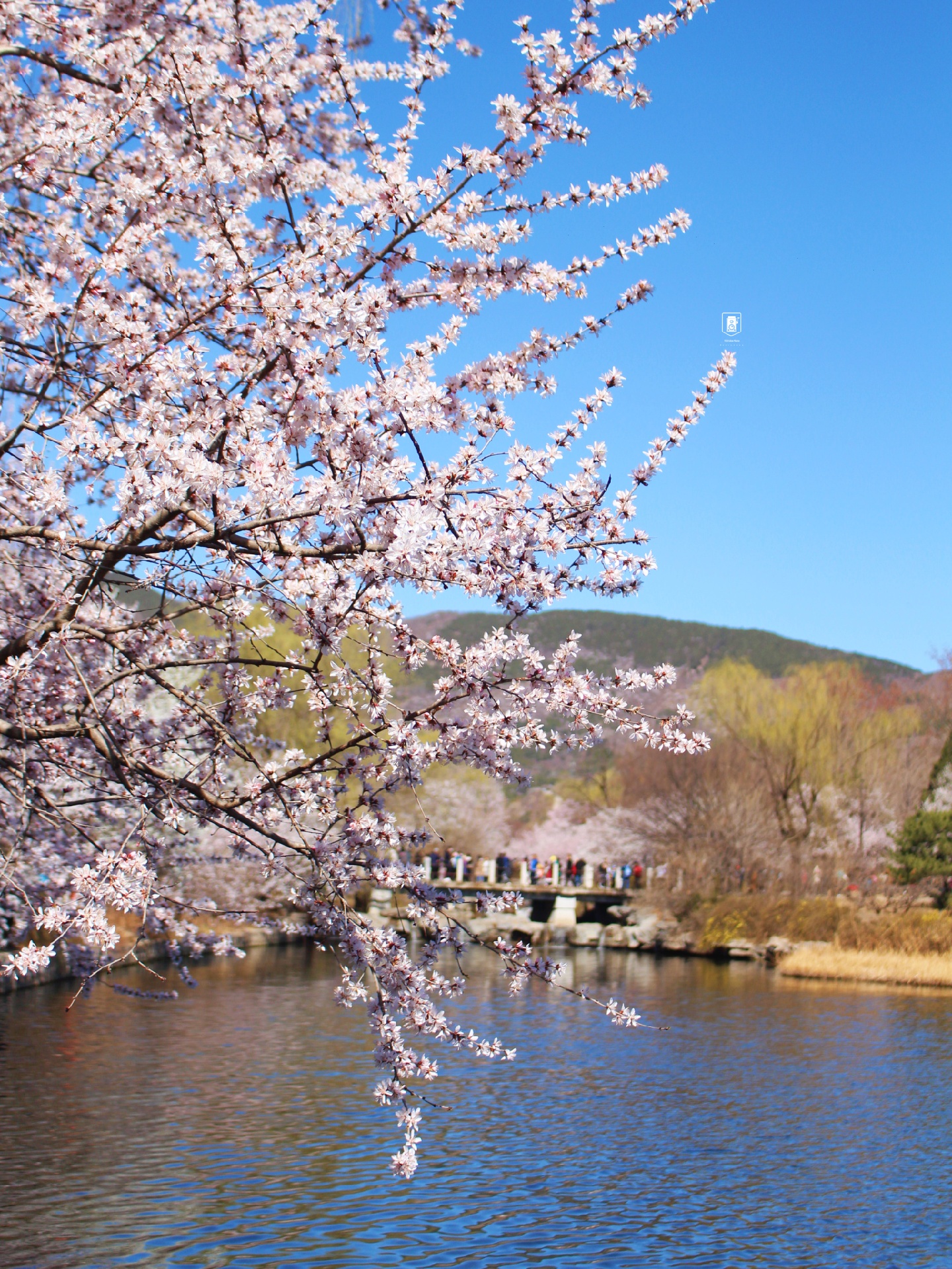 ✅站在澄静湖南边广场拍,以湖边的山桃花为前景,拍摄站在桥上的人,很美,适合拍人。