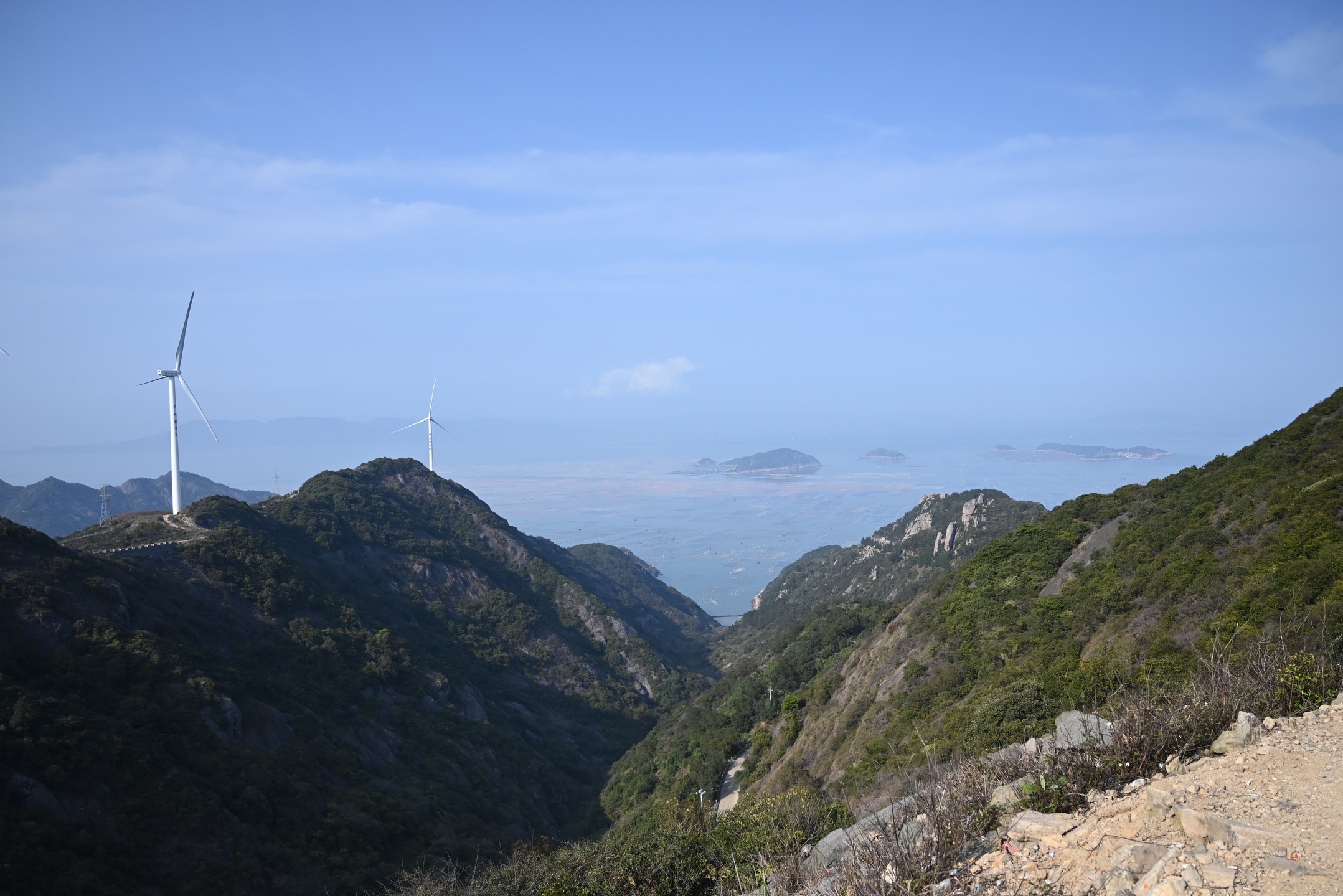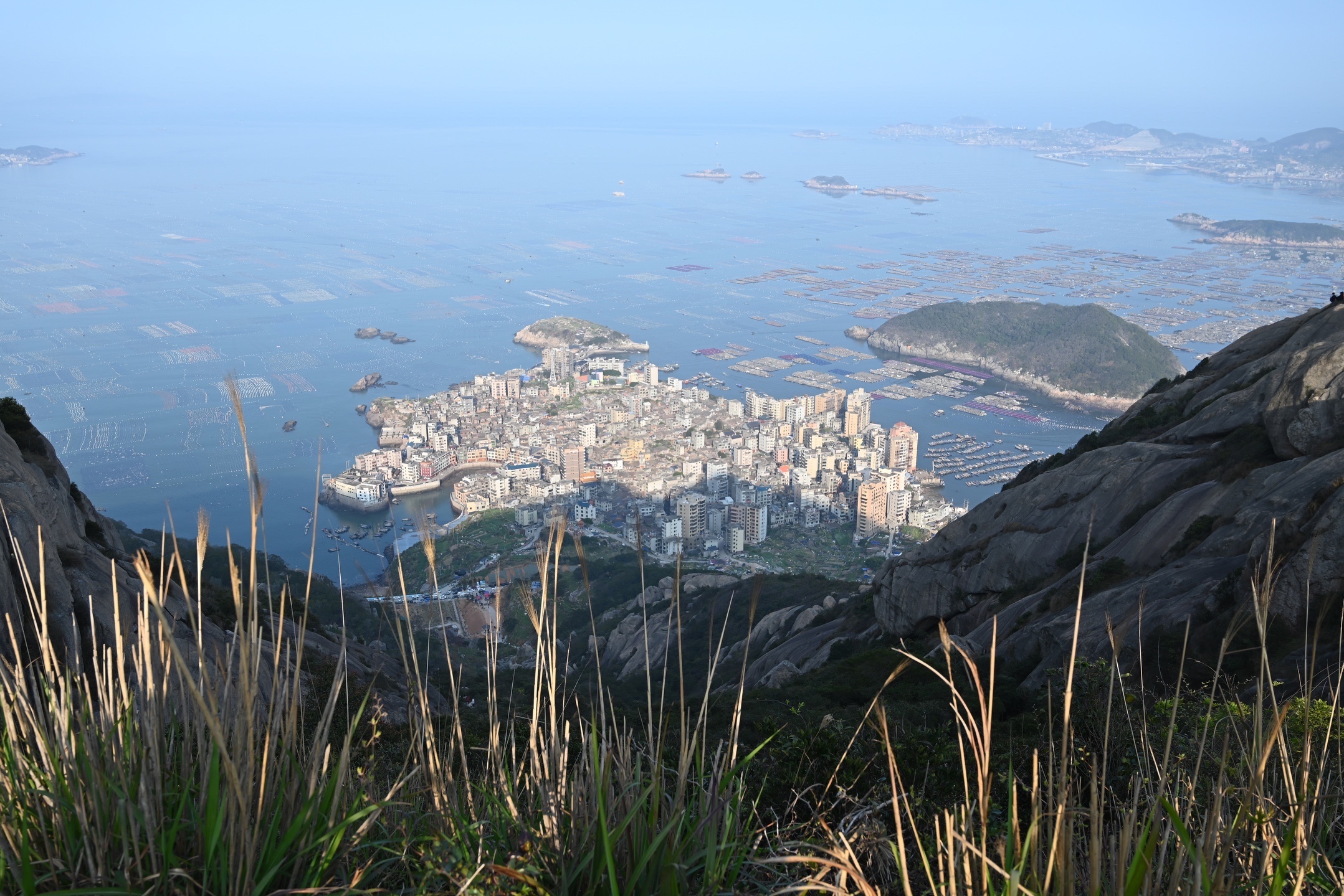 位于福建福州连江奇达村的旗冠顶,站在山巅可以俯瞰整个小渔村和海洋。因为广阔的视野,在这里你可以看到天空和海洋的交界线,一眼望去全是蓝色。