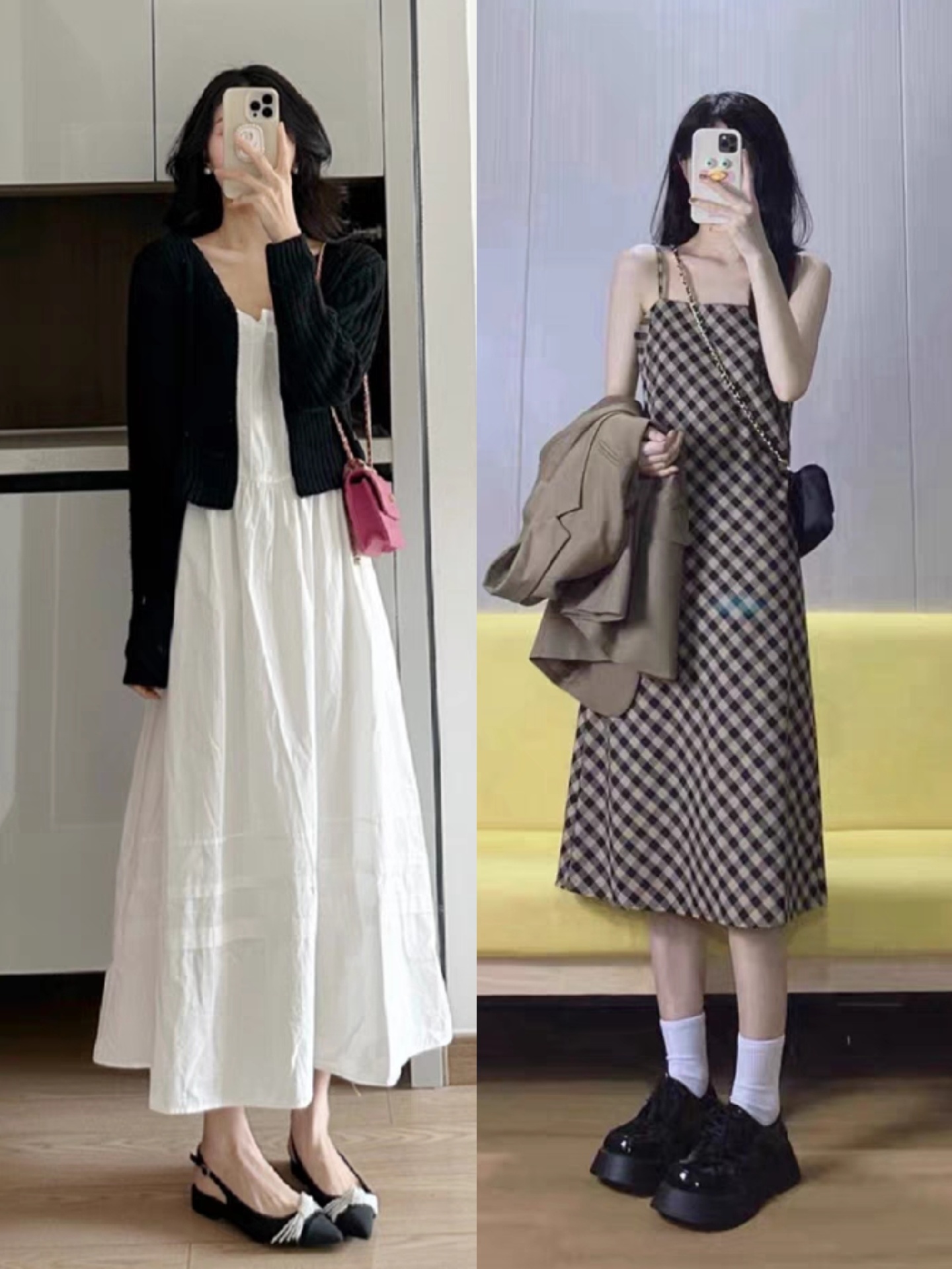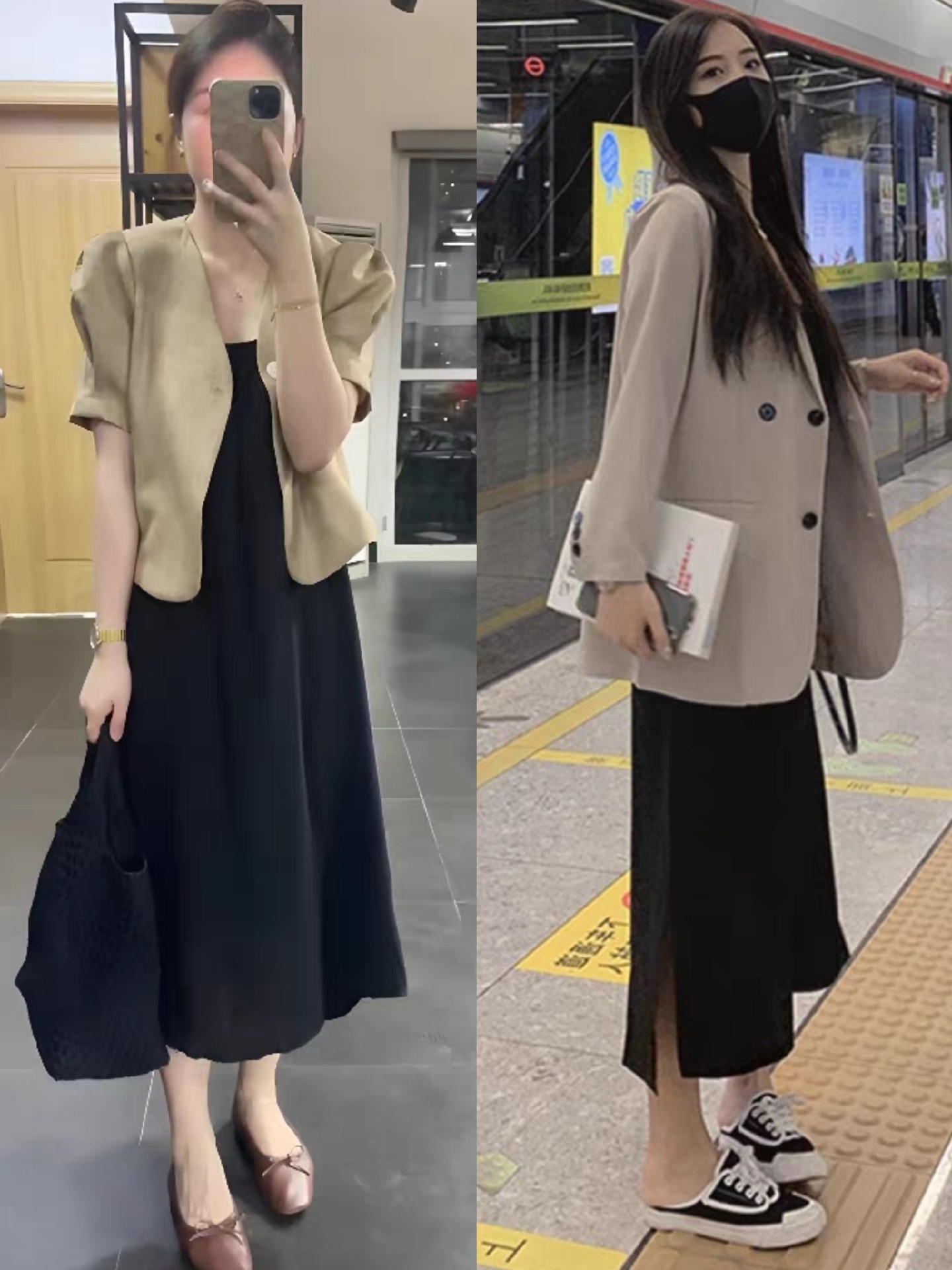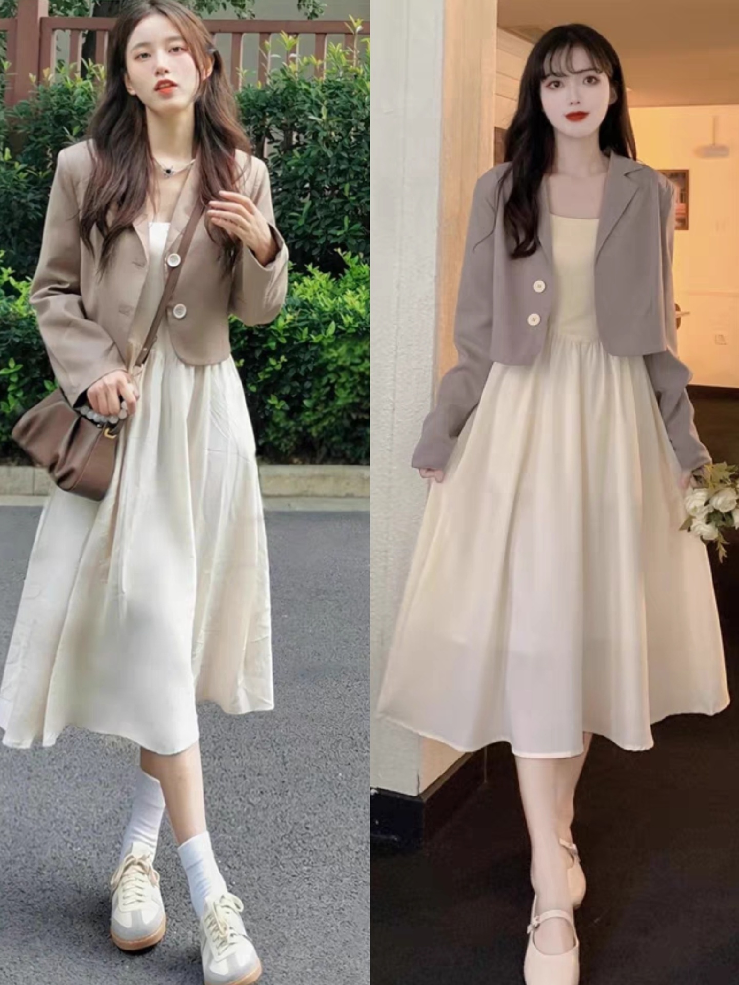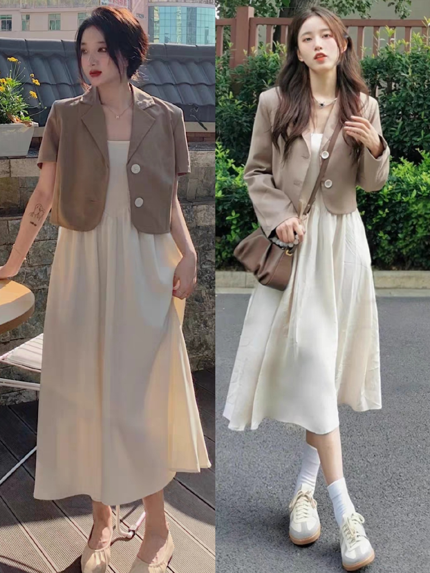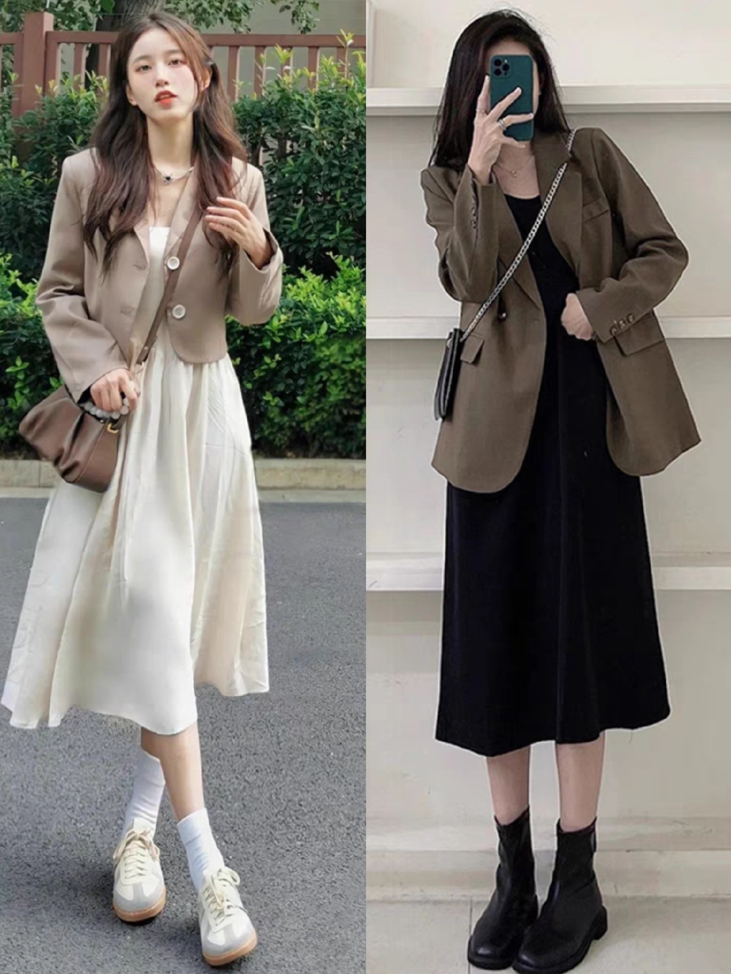 第一,西装搭配连衣裙。