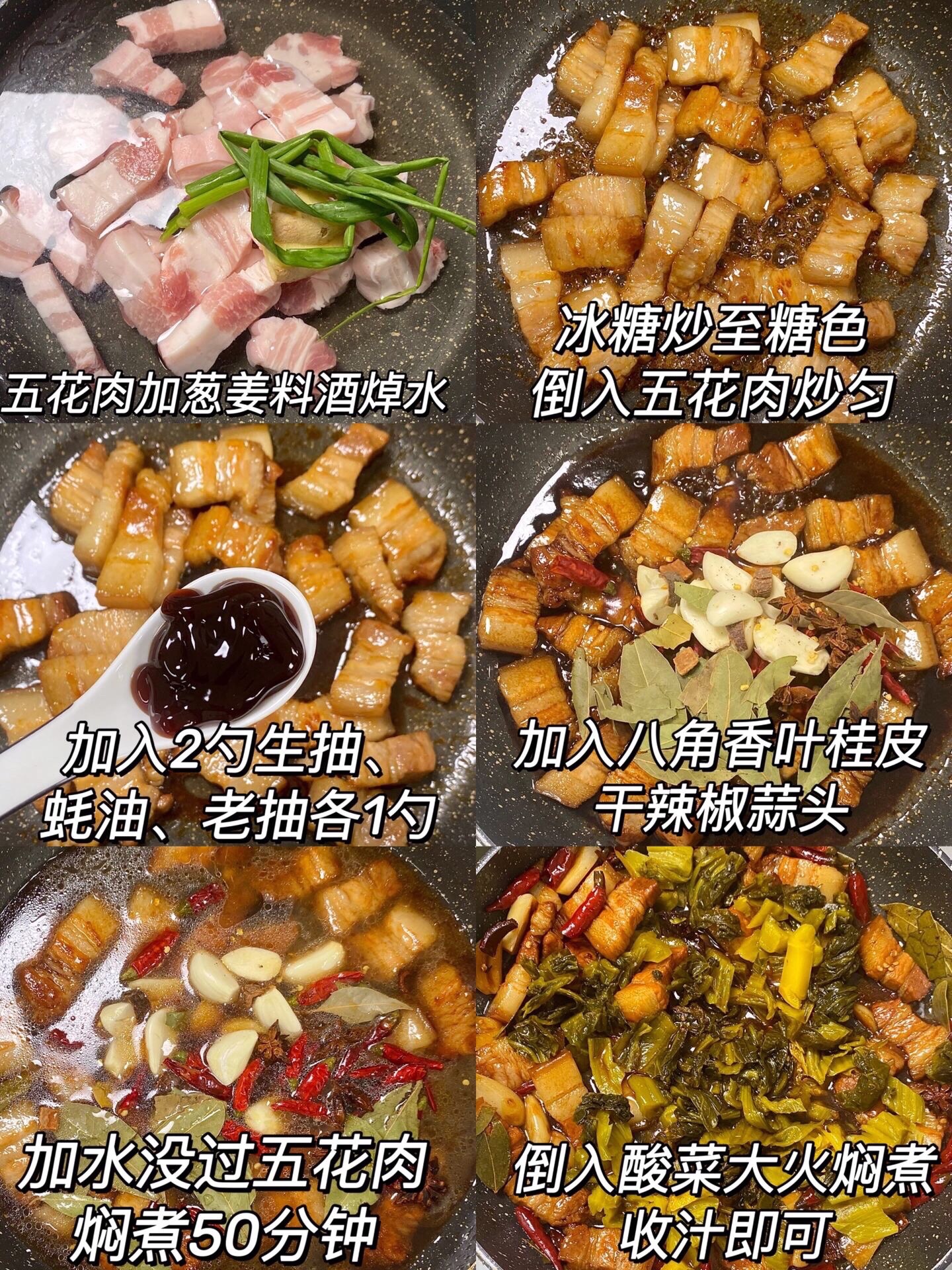 2⃣️加2勺生抽➕1勺蚝油、1勺老抽,再加入八角桂皮香叶,干辣椒,蒜头加水没过五花肉焖煮50分钟,倒入酸菜大火焖煮收汁即可