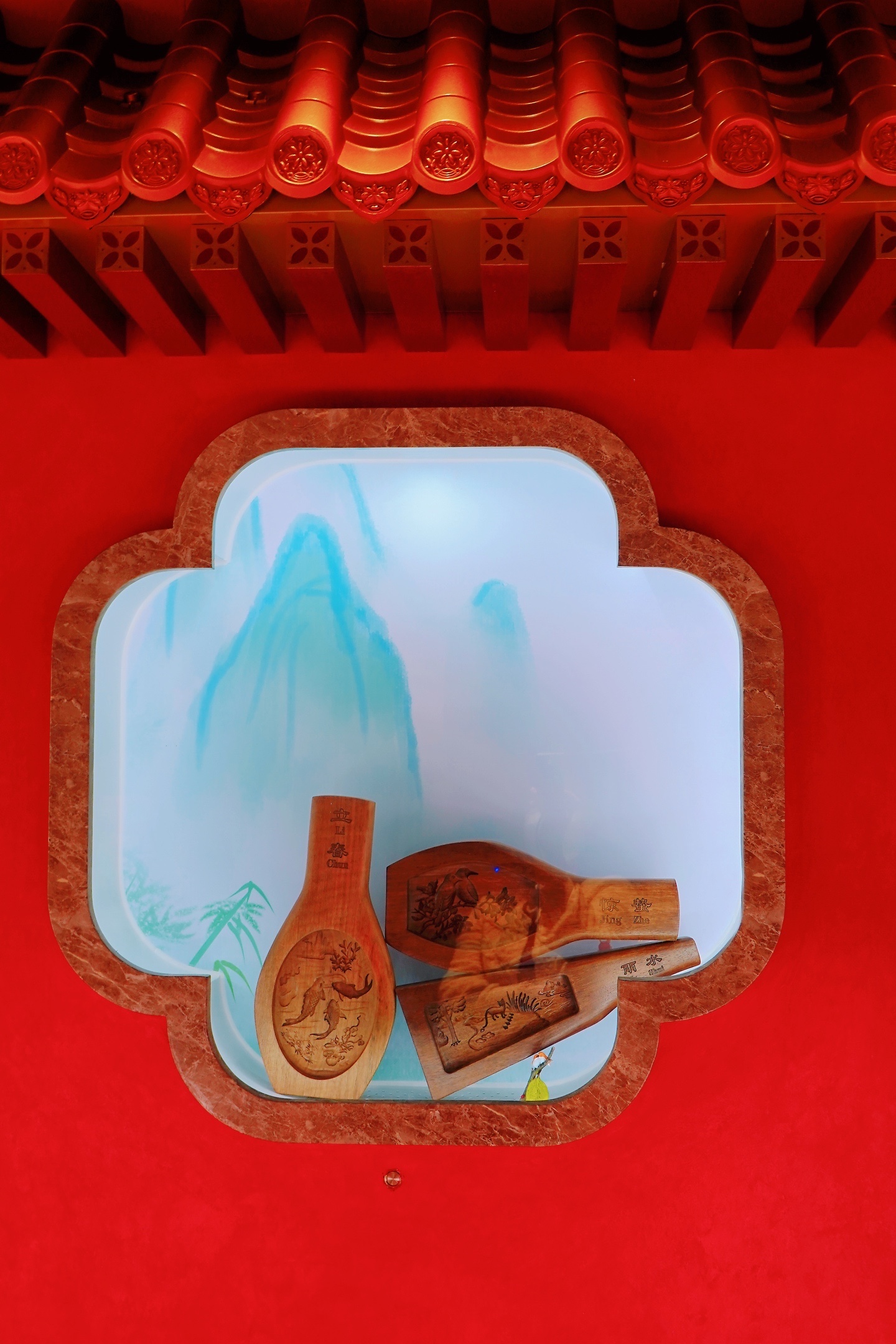 ❤️镶嵌在红色墙面上的展示橱窗里