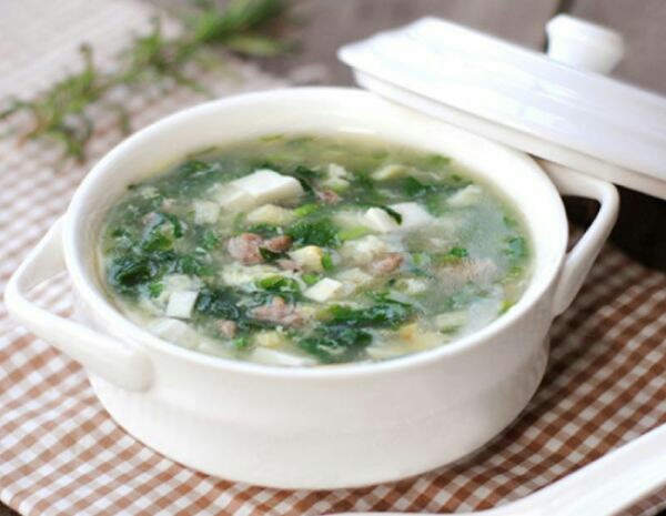 接着加入适量开水,大火煮开,放入豆腐丁,煮一分钟,再倒入荠菜,继续煮一分钟。