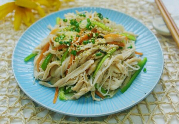 煮熟的鸡胸肉很容易扎透,可以试一试。煮好后,将鸡胸肉撕成细丝。