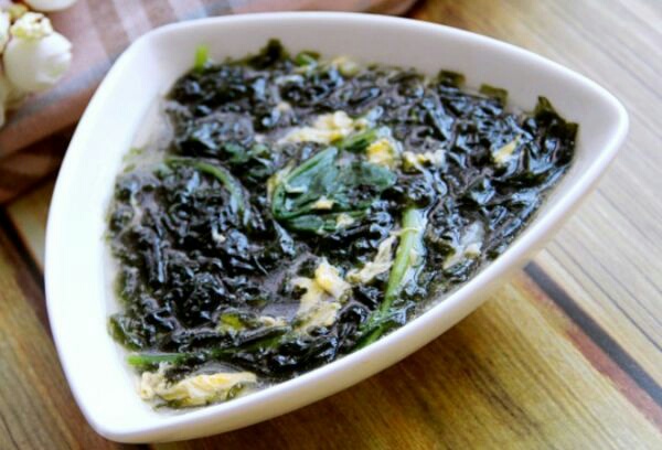 锅内重新加水,煮开后放入紫菜、菠菜,煮一分钟,加盐、鸡精调味。