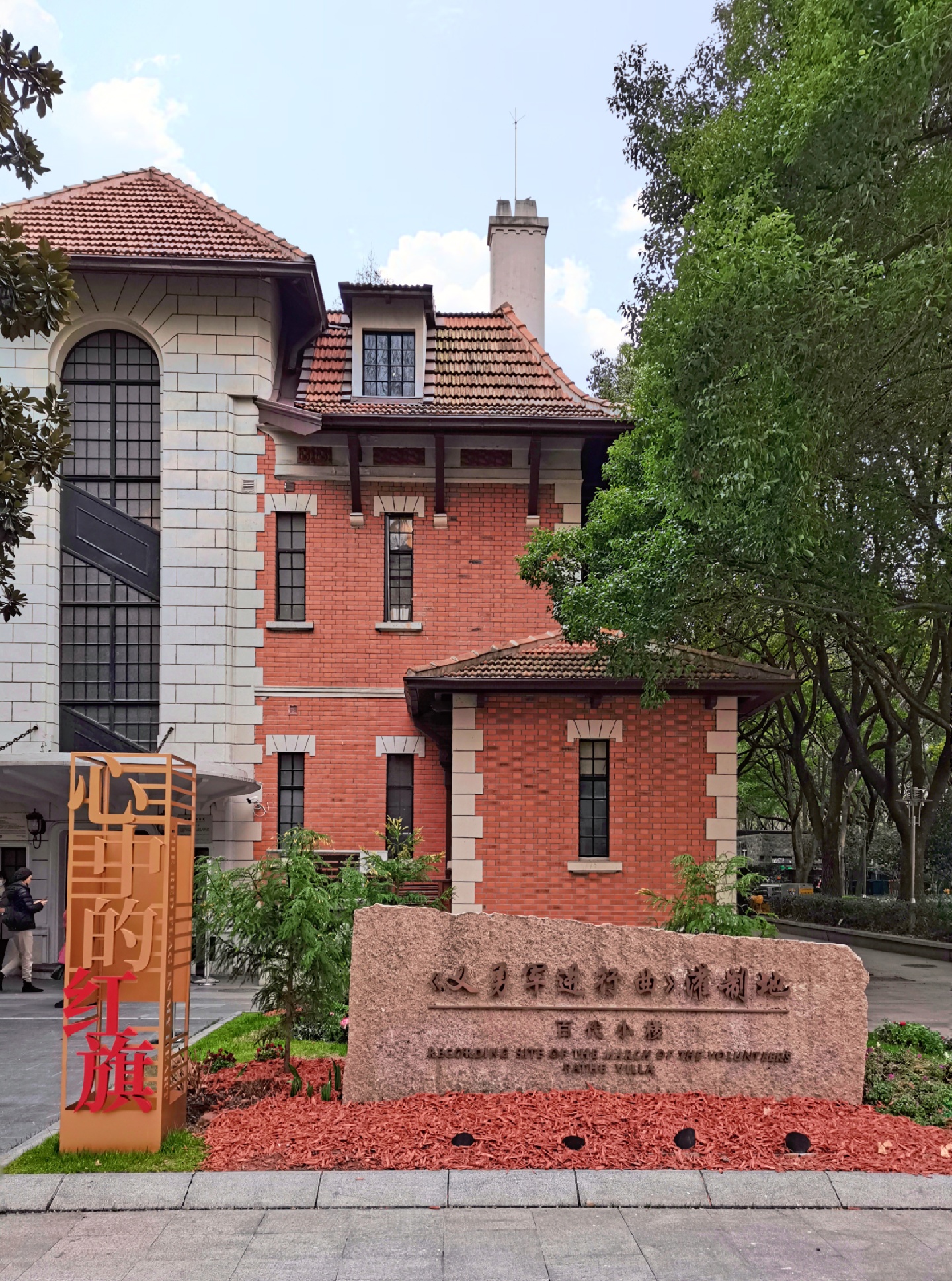 “百代小红楼”位于上海衡山路811号(徐家汇公园内),建于1921年,占地面积约192㎡,建筑面积480㎡。这幢法式三层花园住宅,因其红瓦坡顶和周身的红砖墙面,在沪上被称之为“小红楼”,为上海市优秀历史建筑,市级文物保护单位。该住宅最早拥有者是两位法国商人,1930年被法国百代唱片公司收购,1934年聂耳担任该公司音乐部主任,国歌《义勇军进行曲》诞生在这里。(1)