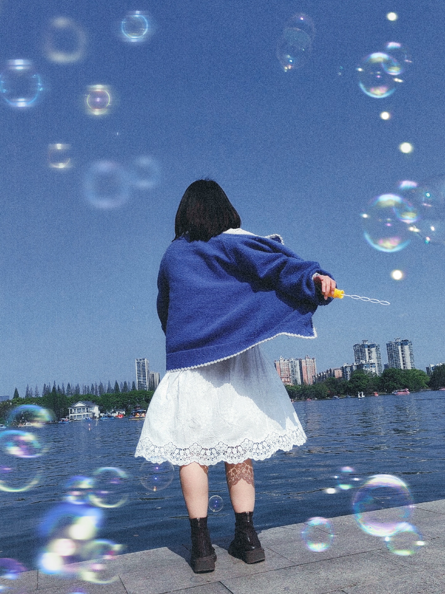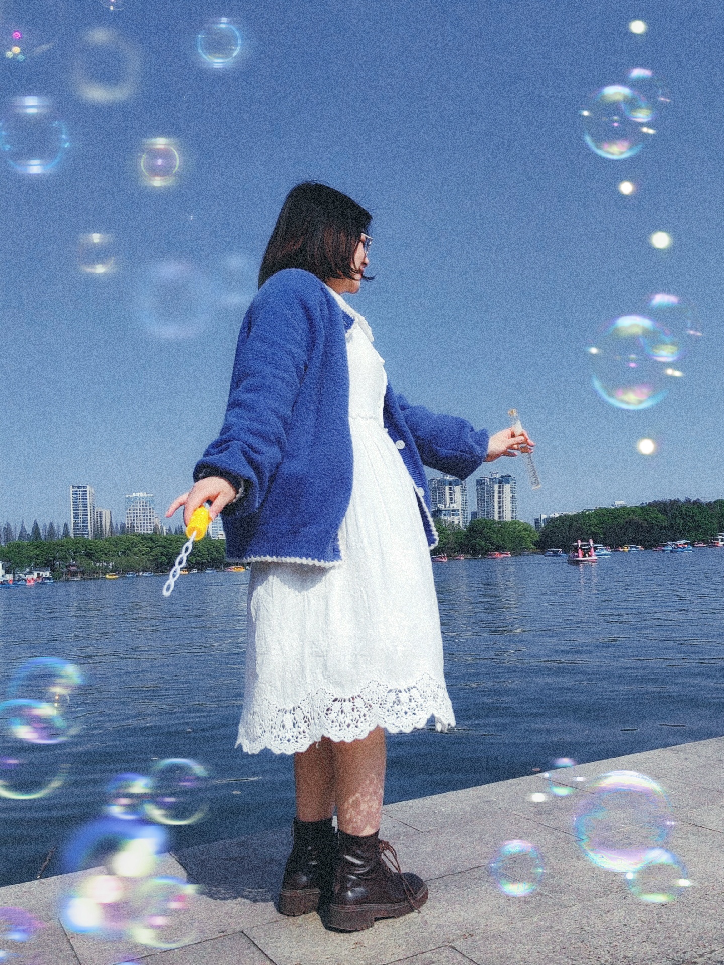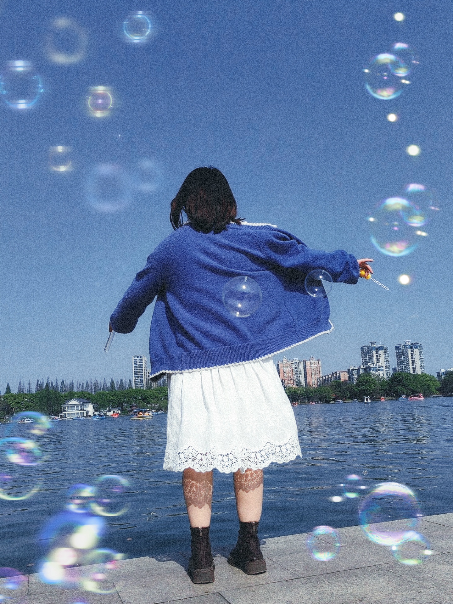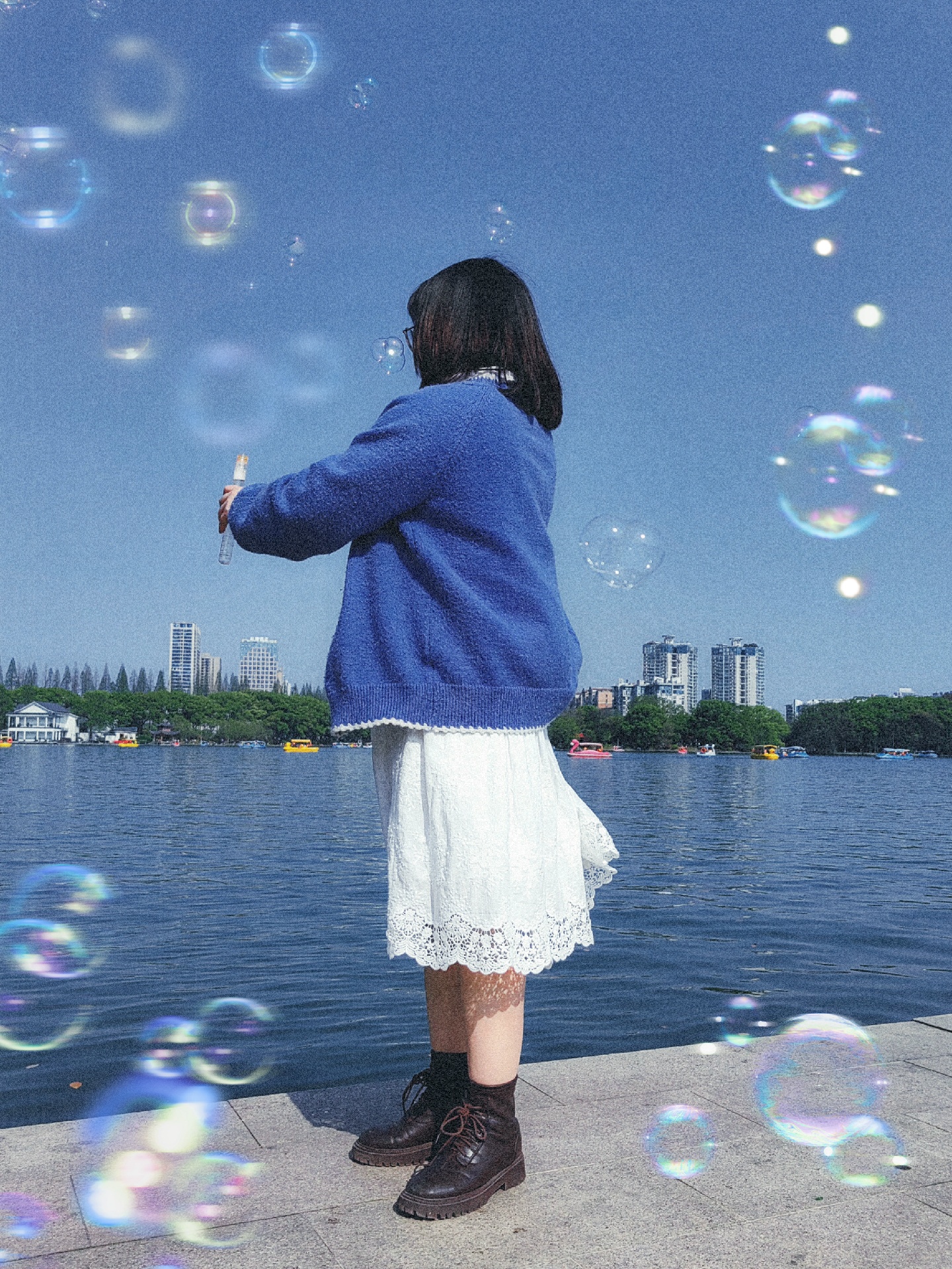 第一,拿到泡泡慢慢转圈圈,让朋友蹲下来连拍。