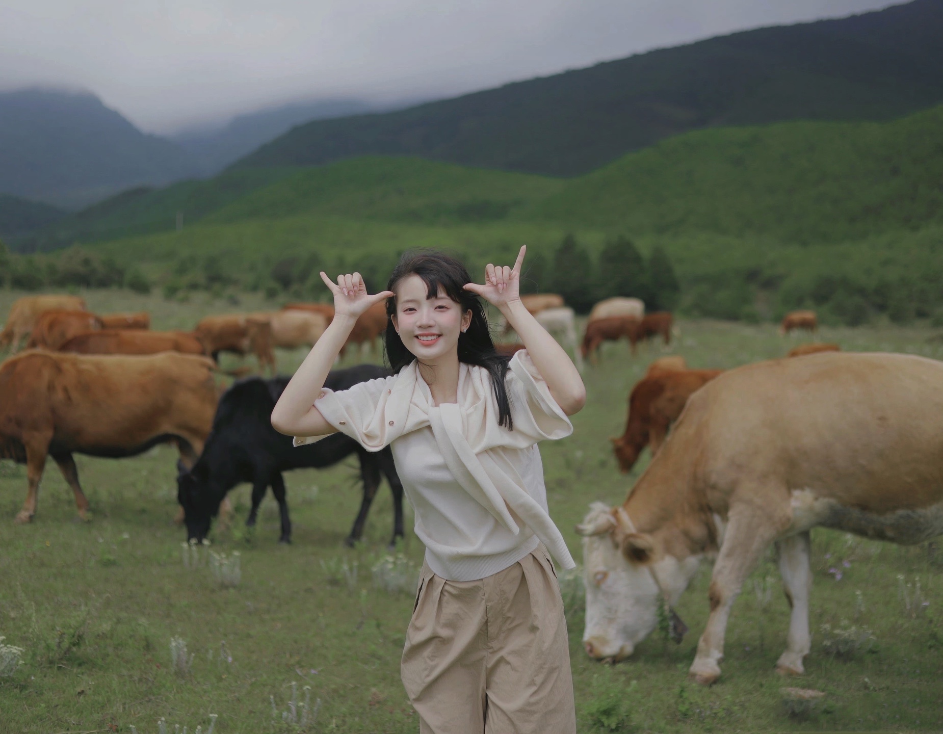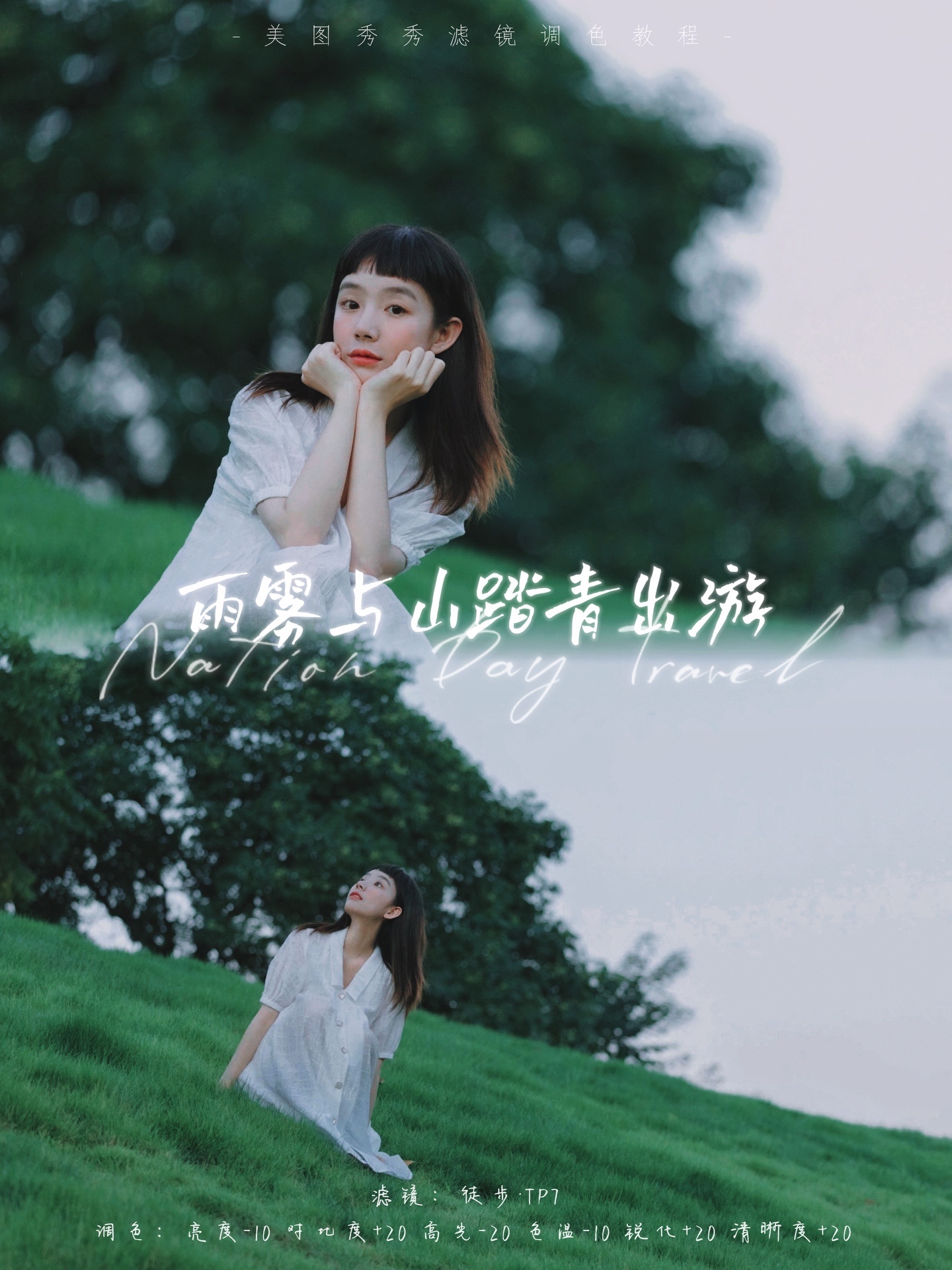 美图秀秀App搜「雨雾与山踏青」套用配方
