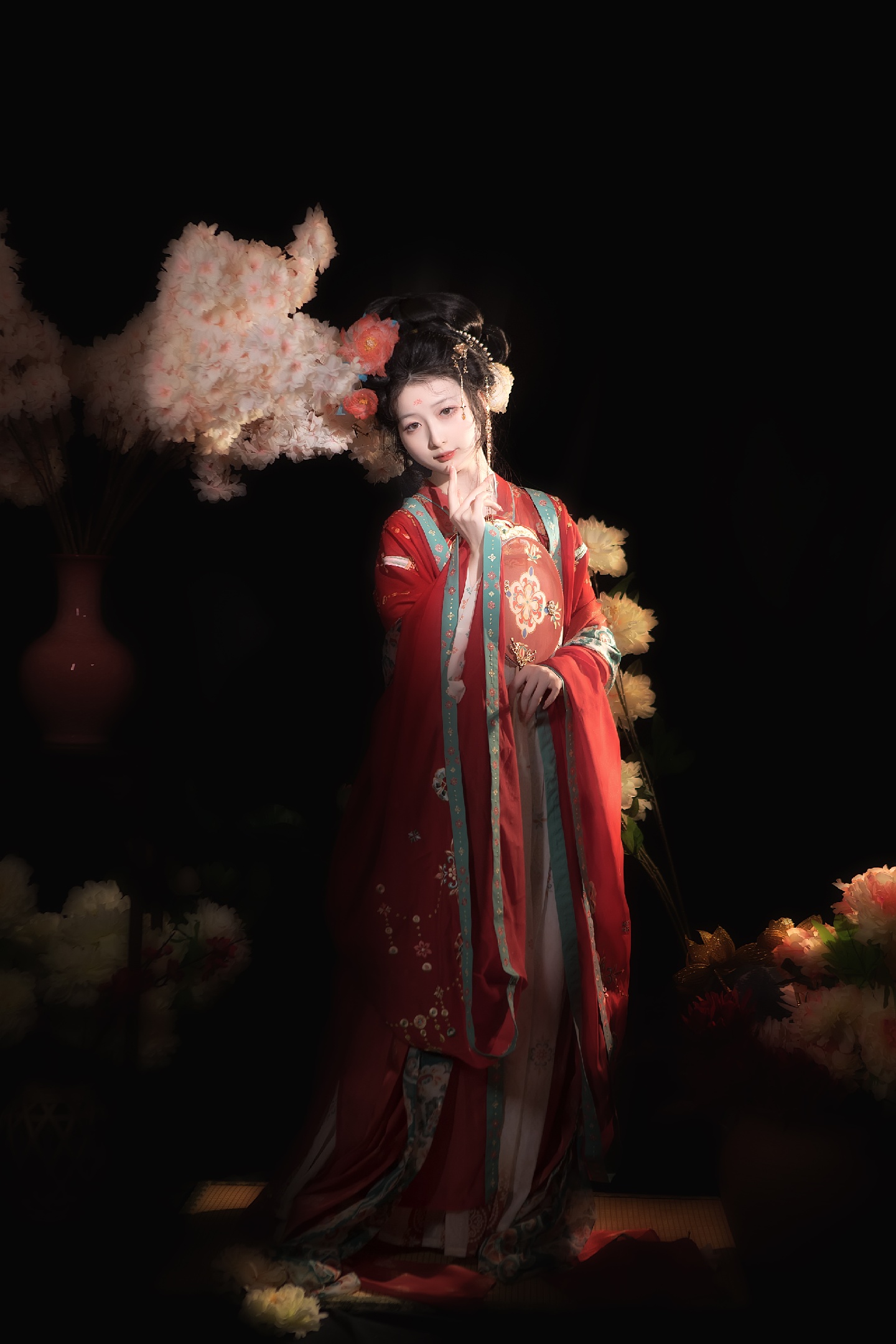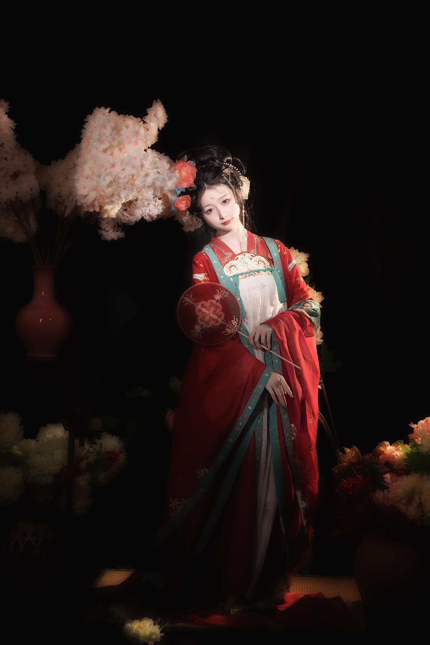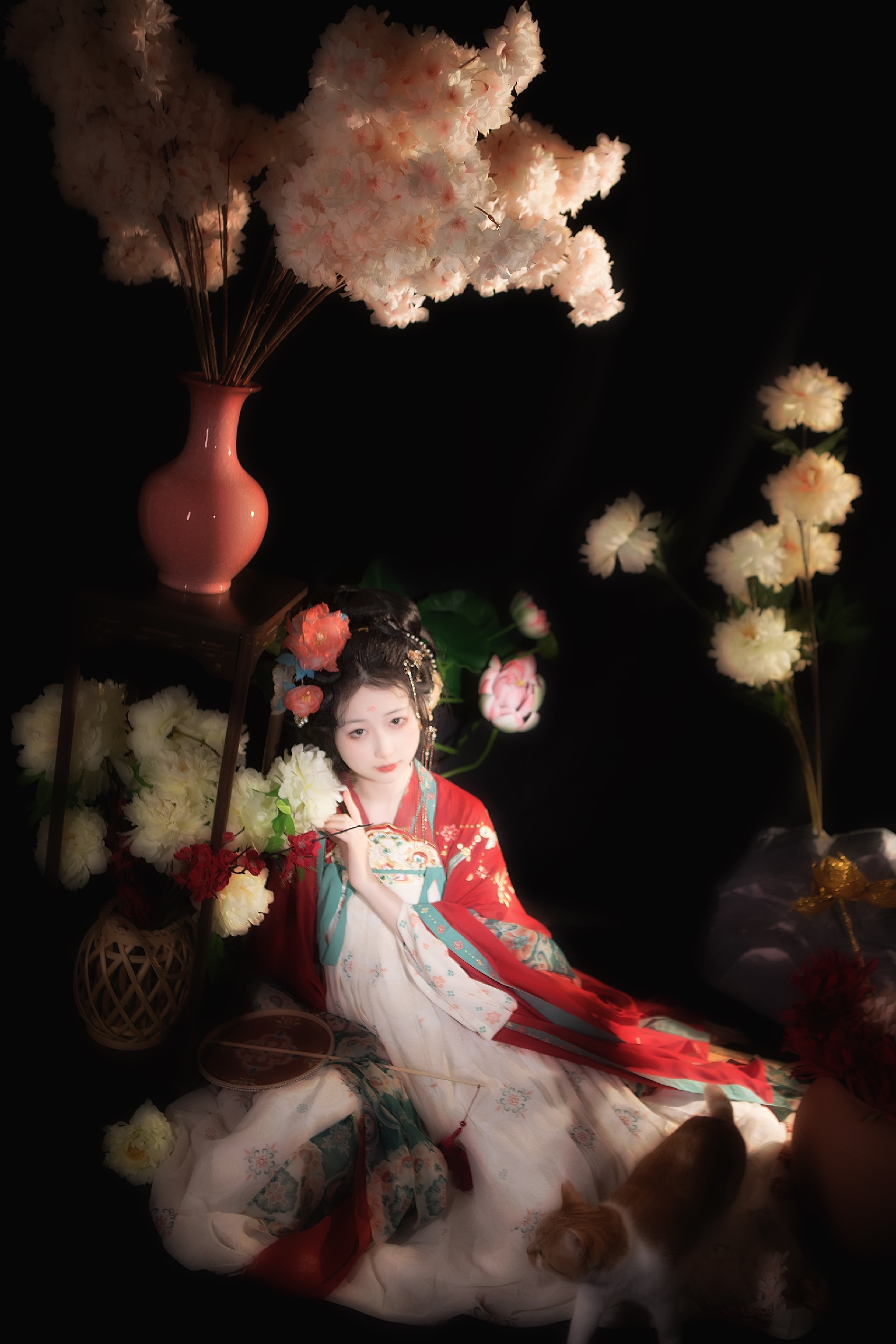 1.总结一下这次使用的道具:假花有樱花,牡丹,莲花,荷花,还有不知名花花,反正就是一堆花,然后用了花瓶,一个古风小桌子高款,-一个榻榻米,手上拿的是一-把唐风扇子。