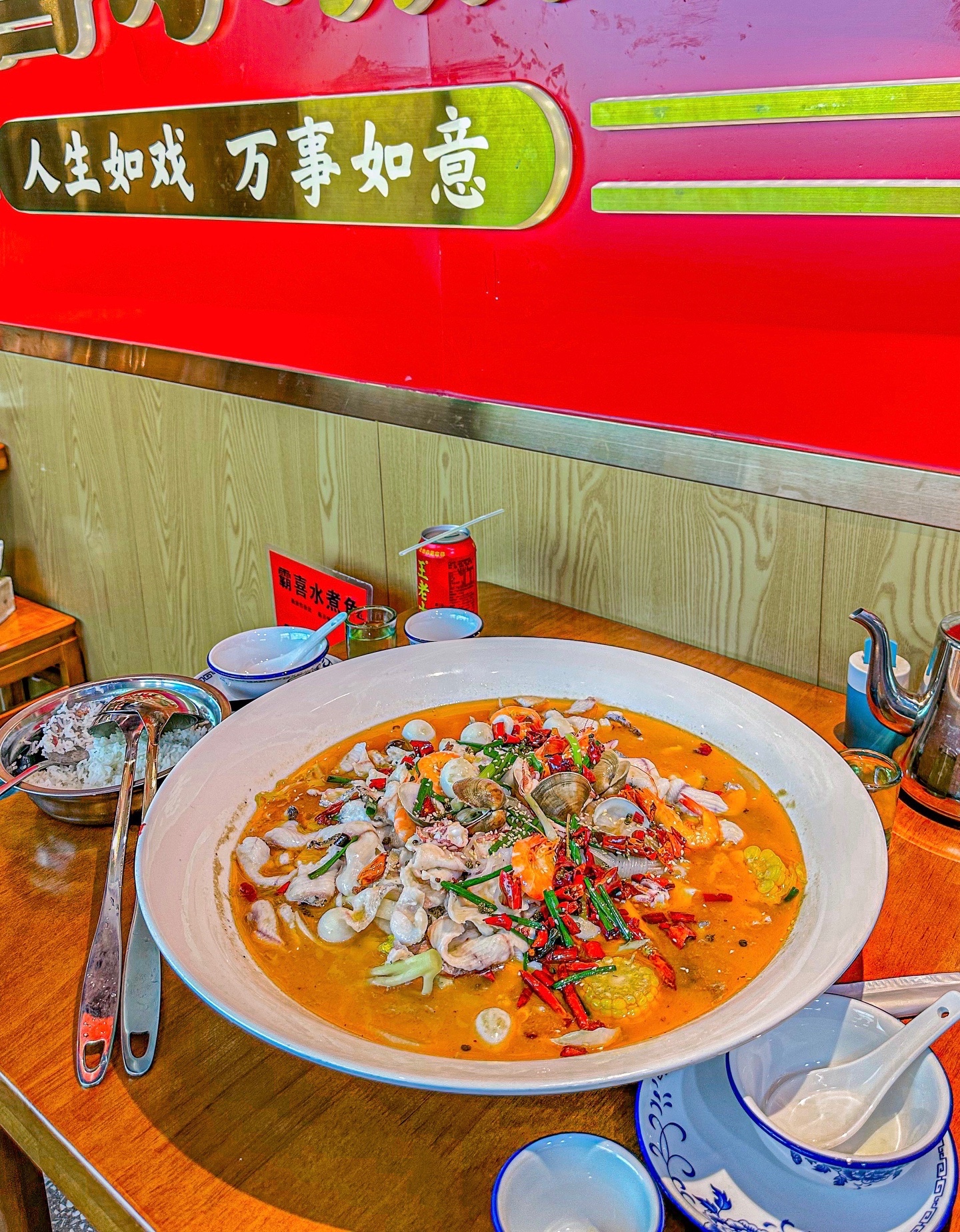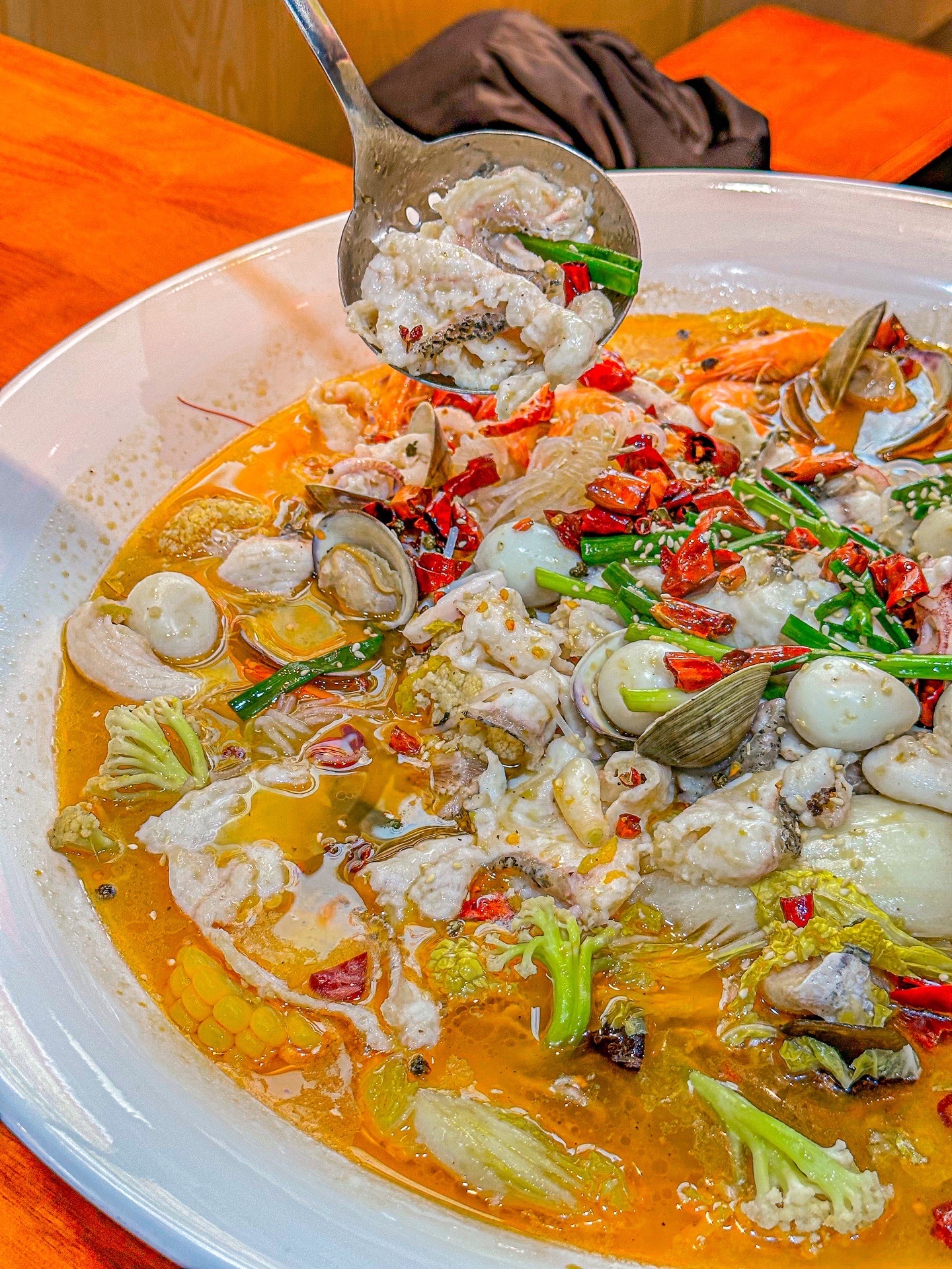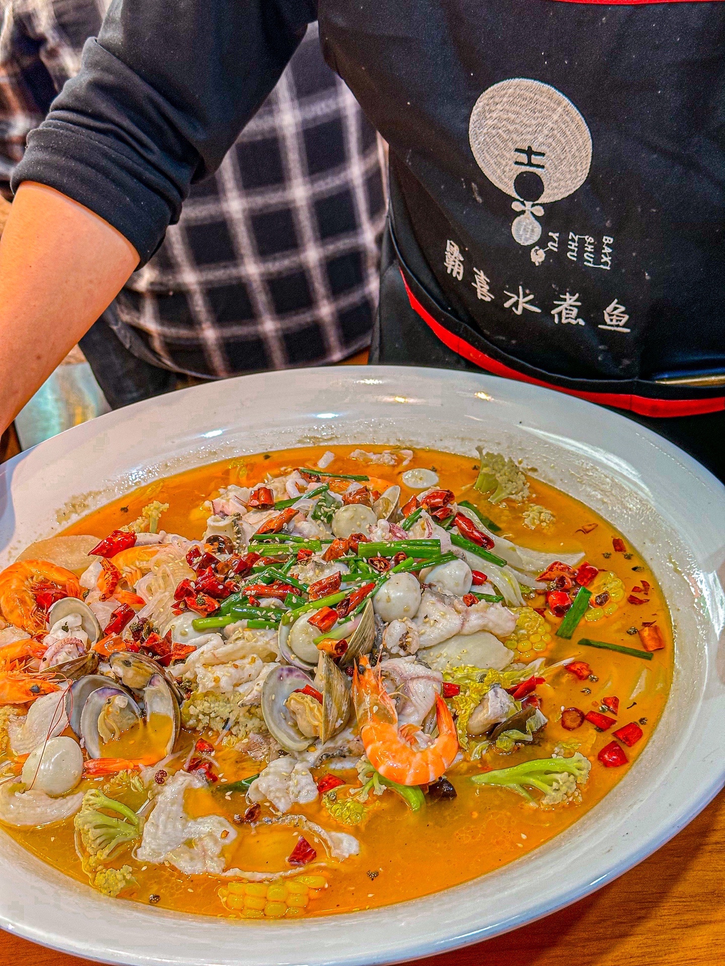 看到老板从店里端出这么一大盘水煮鱼,我瞬间就走不动了,份量那么大才158,也太划算了吧