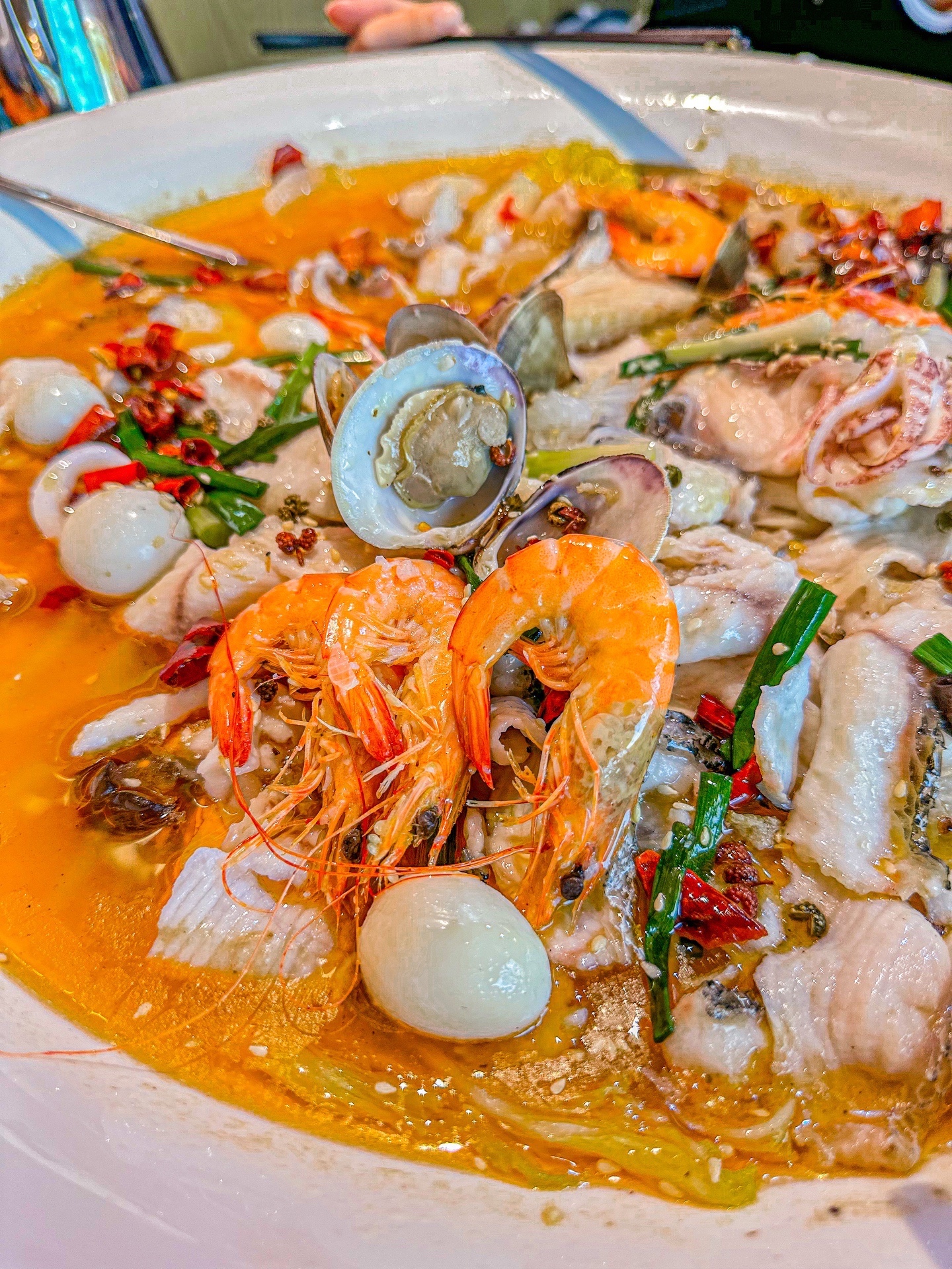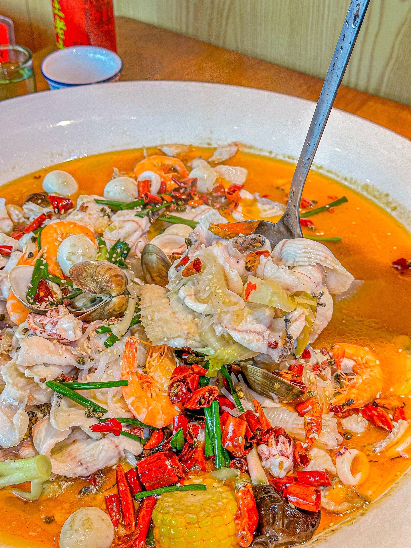 有鱿鱼、活虾、白贝、鹌鹑蛋、腐竹、花菜、玉米、魔芋....