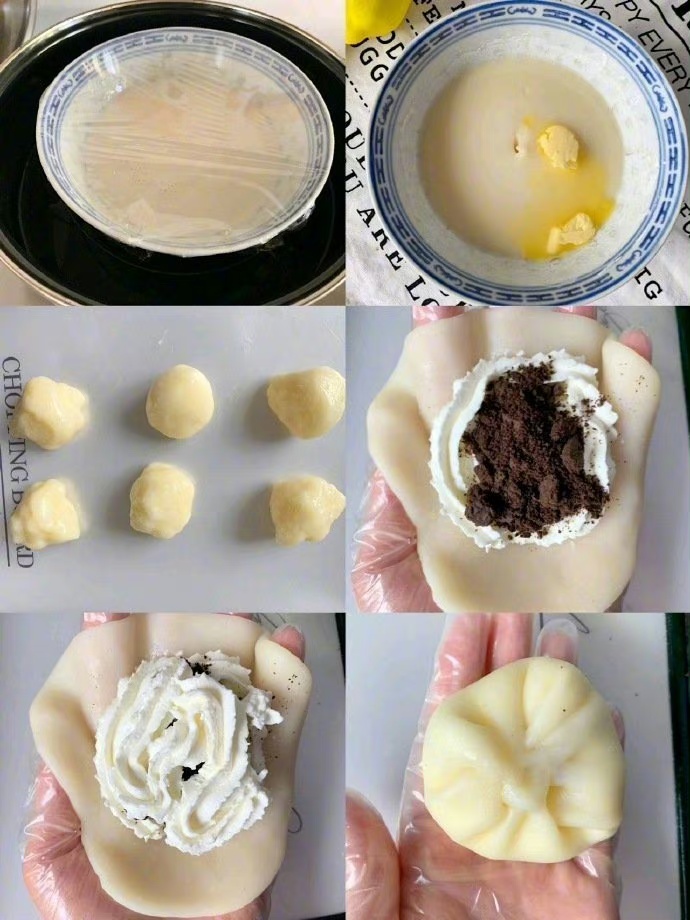✅糯米面团分成6份,擀成薄片,挤入奶油,中间放奥利奥饼干碎再挤上一层奶油,捏紧收口。