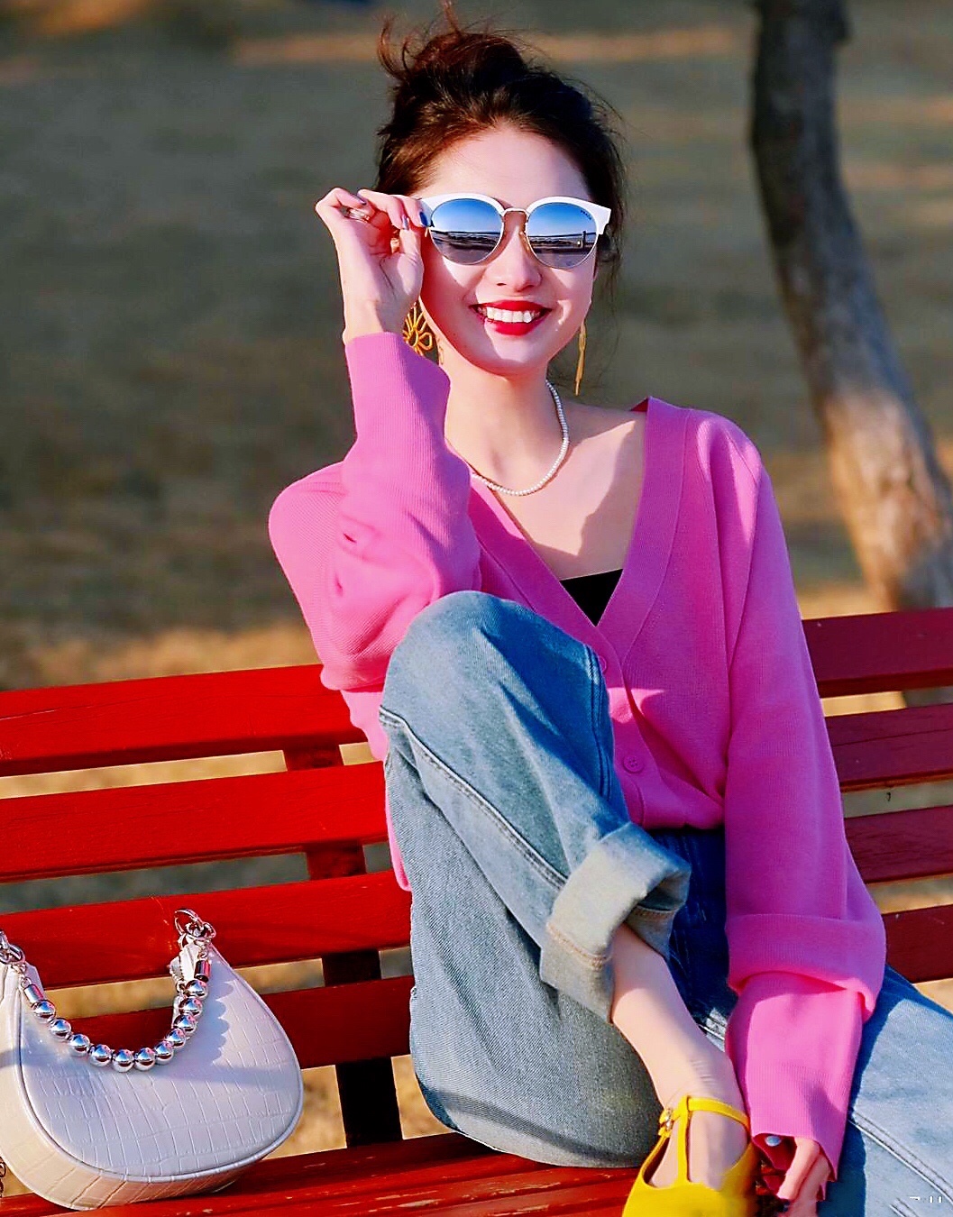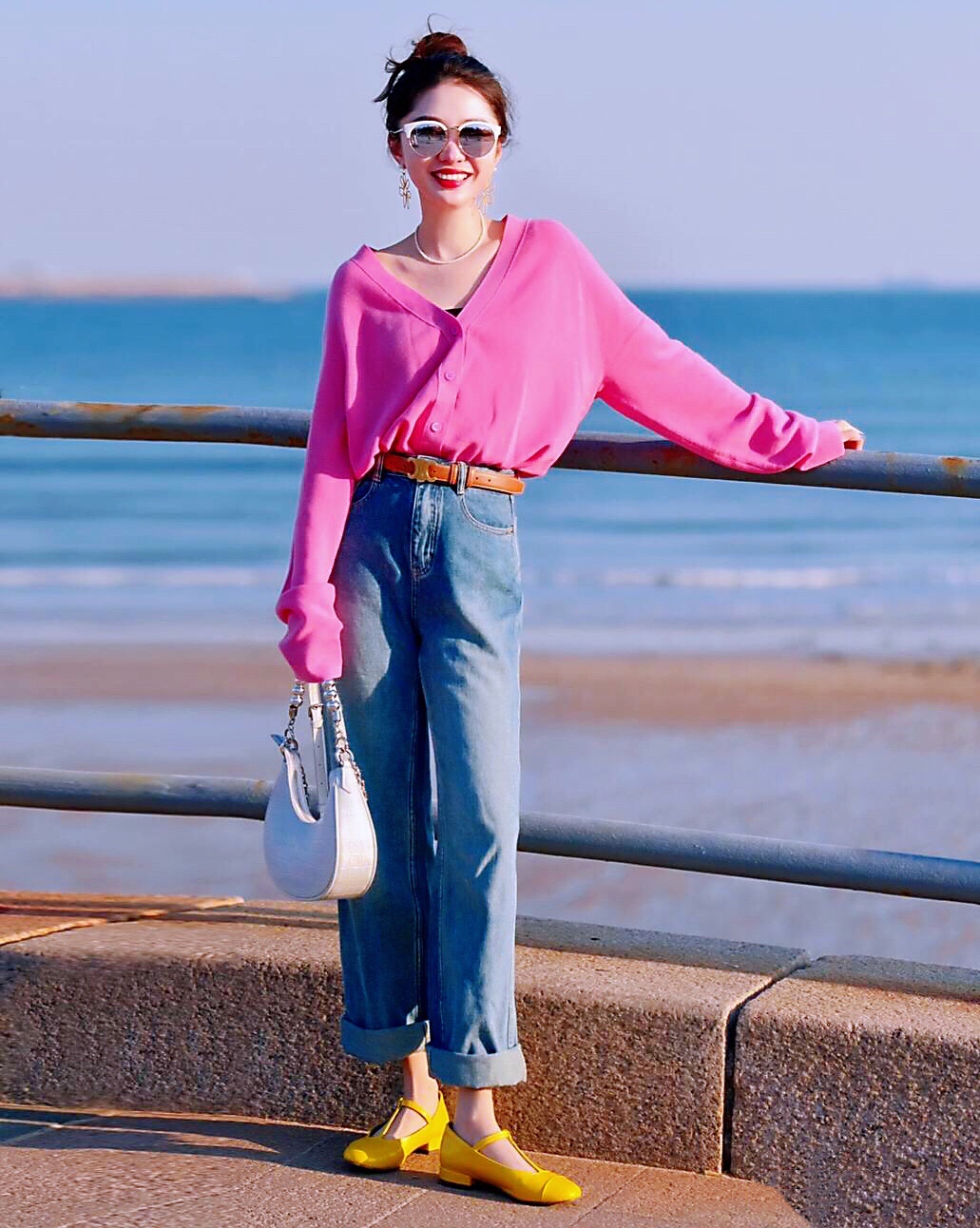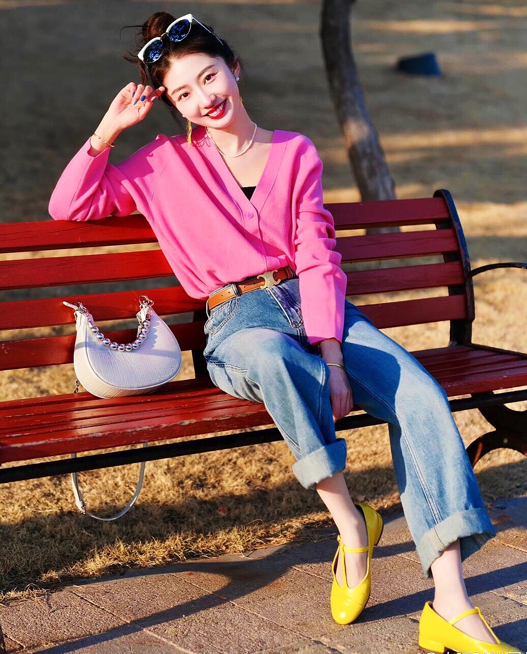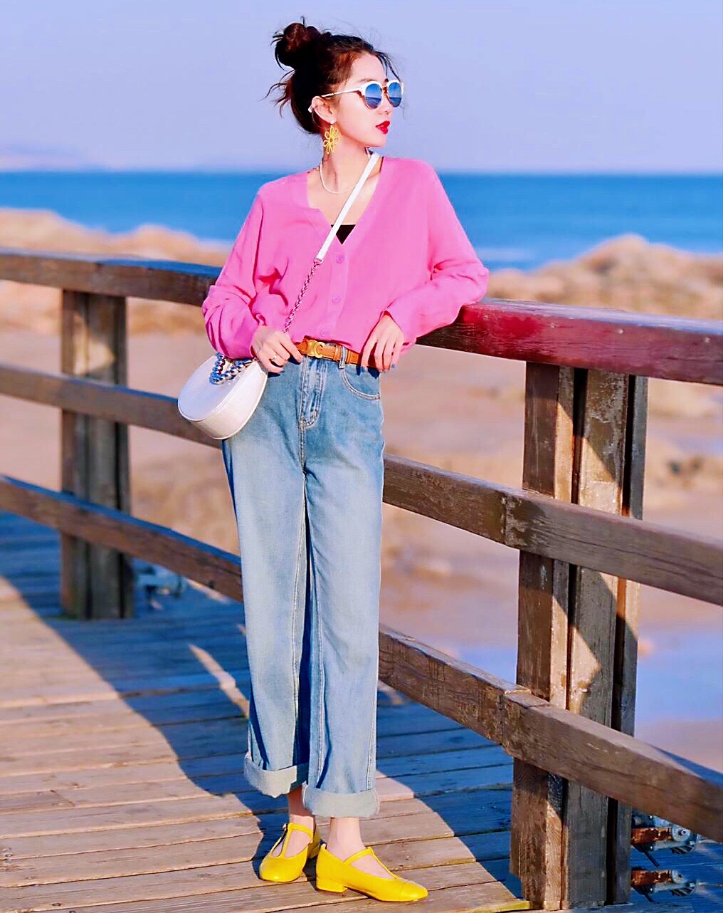 玫瑰红衬衫上衣搭配牛仔裤👖