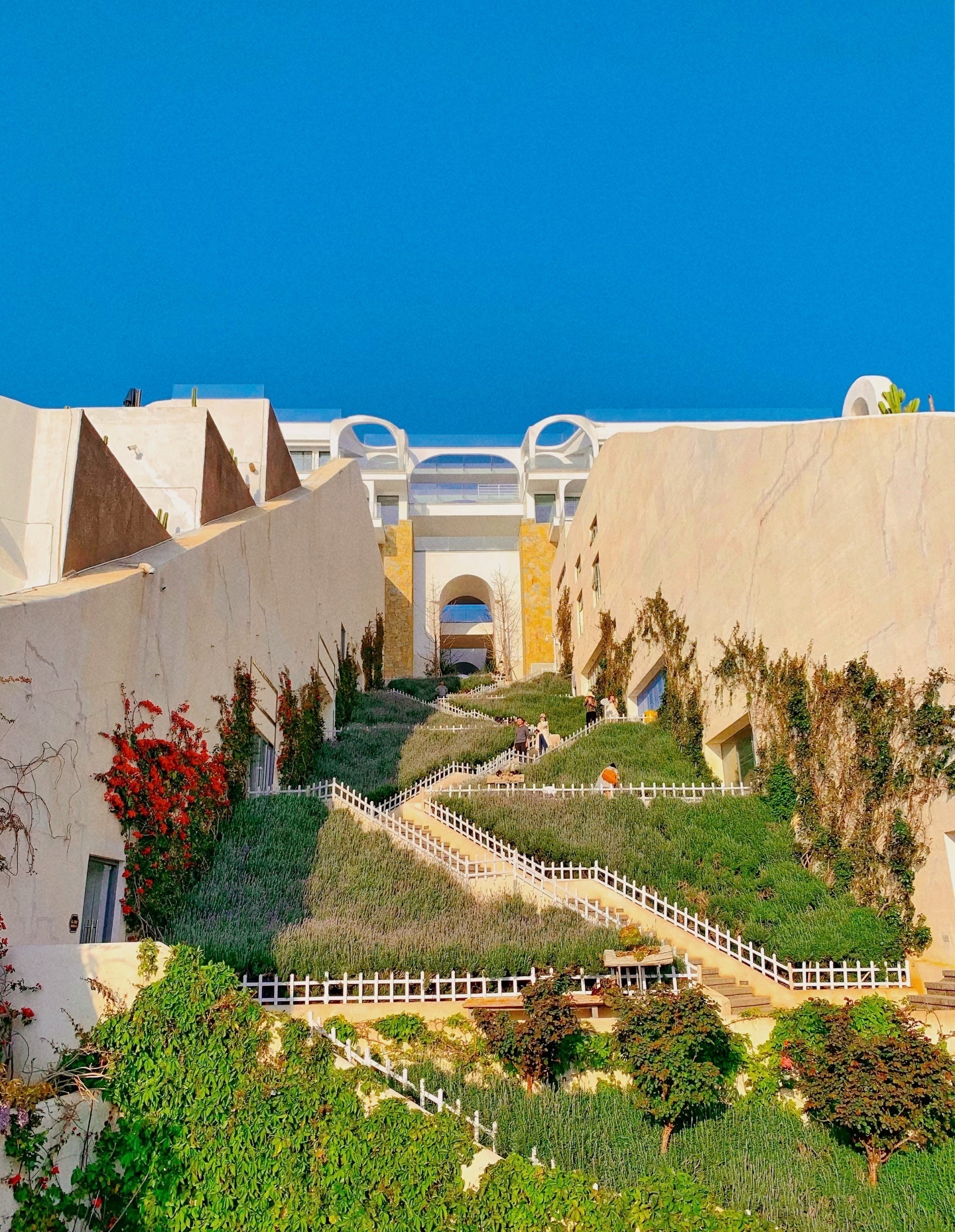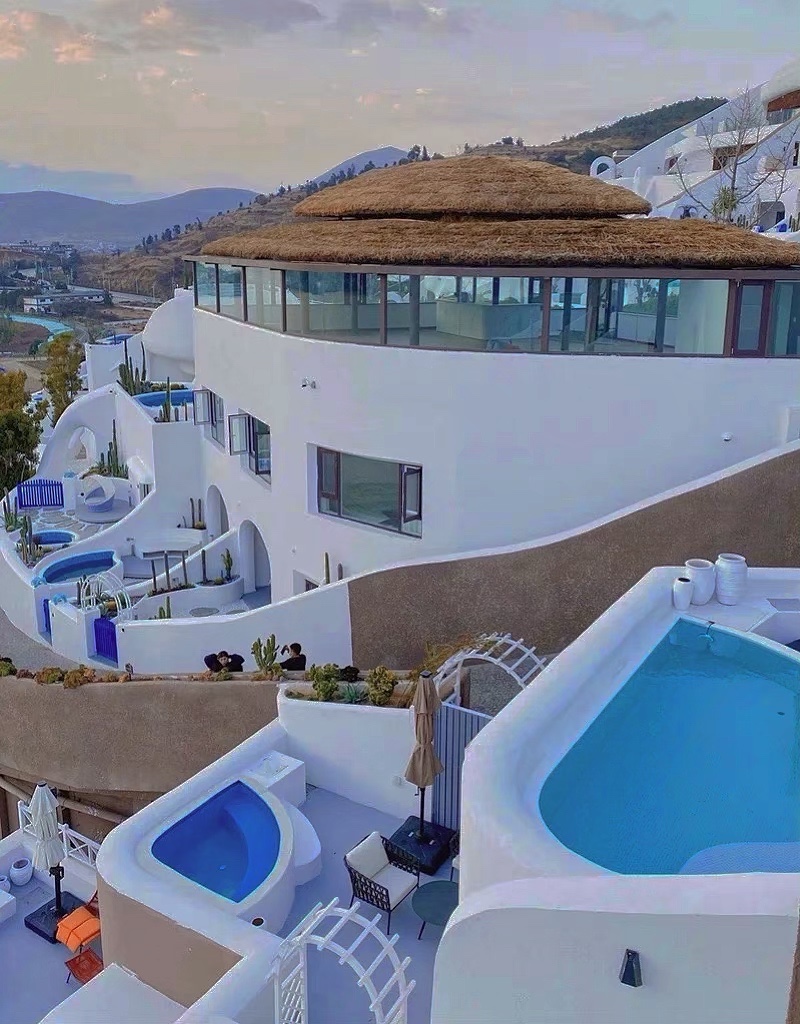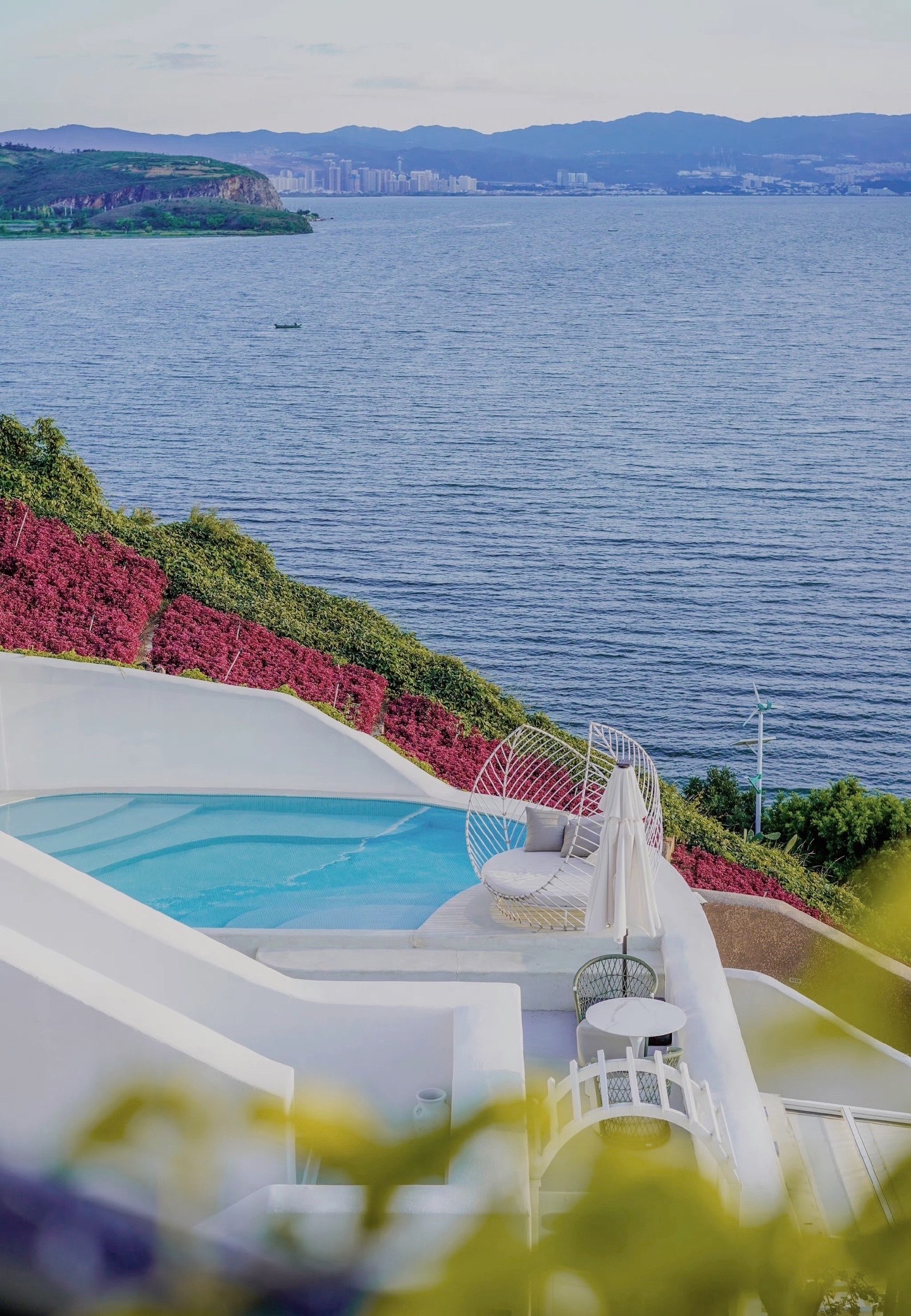 🌺圣托里尼的度假风,白墙+蓝门,还有波点图案的台阶,这是我认为最好出片的一个风格,拍风景也很美,很干净。这一片有几家酒店民宿,大理松云悬崖酒店大理理想