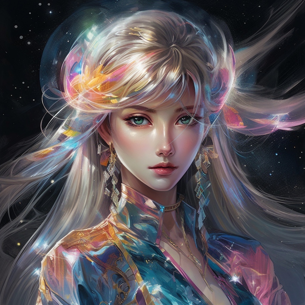 a beautiful Girl , Sailor Moon style , wearing laser transparent pvc texture clothing , prism , melancholy expression , beautiful eyes , brilliance , jewelry , portrait , game original painting , anime character concept design , beautiful face , sacred, long transparent iridescent GB hair, reflections transparent iridescent colors on her hair, highly detailed, gorgeous sacred girl, beautiful light on black background