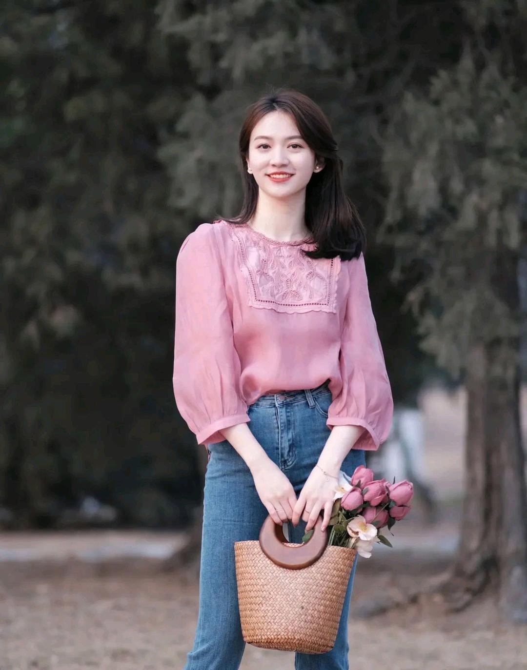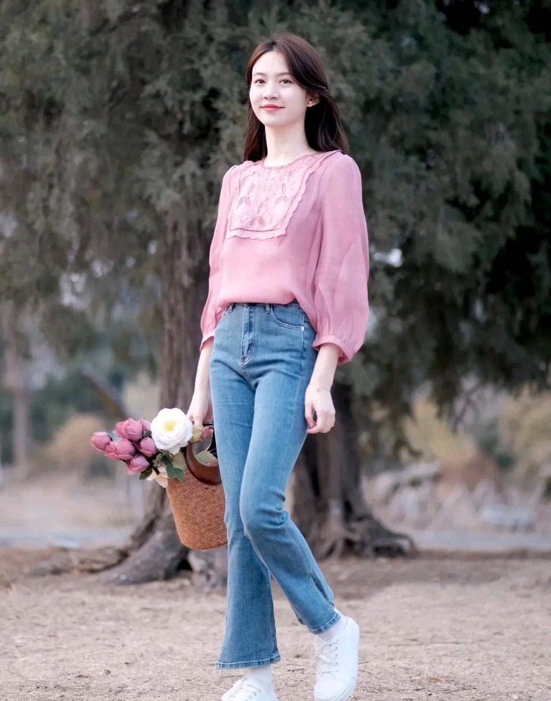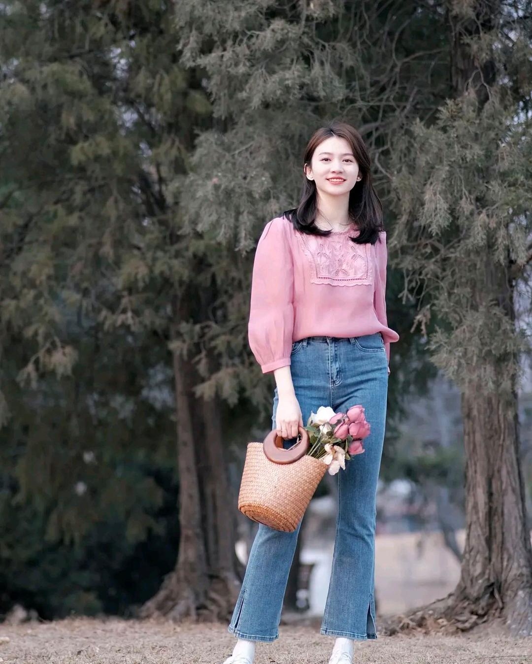 粉红色的上衣,搭配蓝色牛仔裤,轻轻松松就解锁了比较出彩的休闲穿搭。