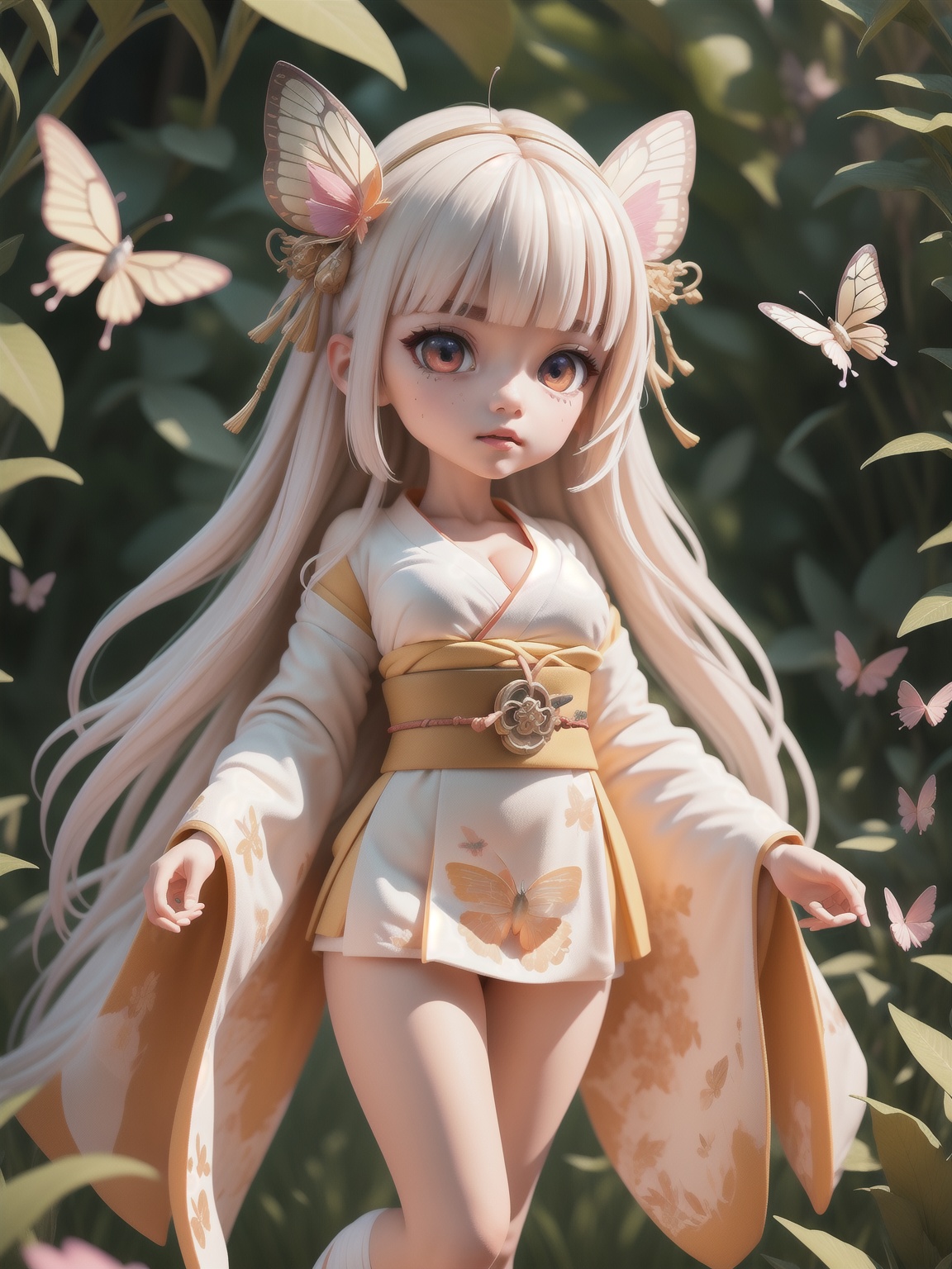 colorful butterfly,girl,red and white puffy long sleeves,(detailed face:1.2),green short hair, an extremely delicate and beautiful, extremely detailed ,highres, extremely detailed, extremely detailed eyes and face, beautiful detailed eyes, light on face, cinematic lighting, full body, full-body shot, (Rainforest),