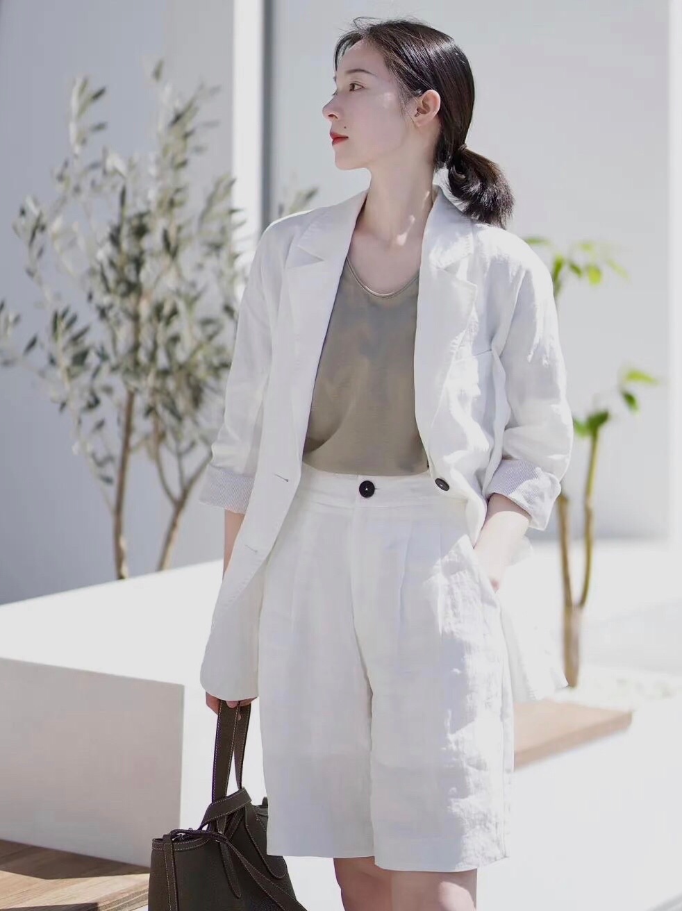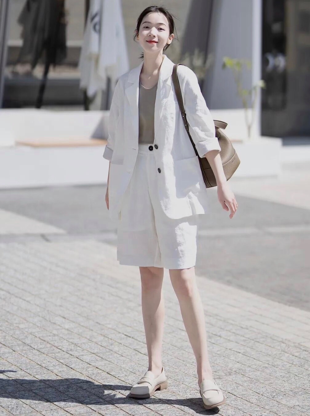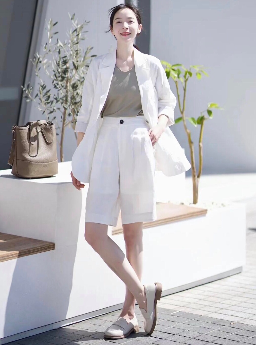这件白色西装外套搭配短裤,秀出美腿线条,更多的清爽了。