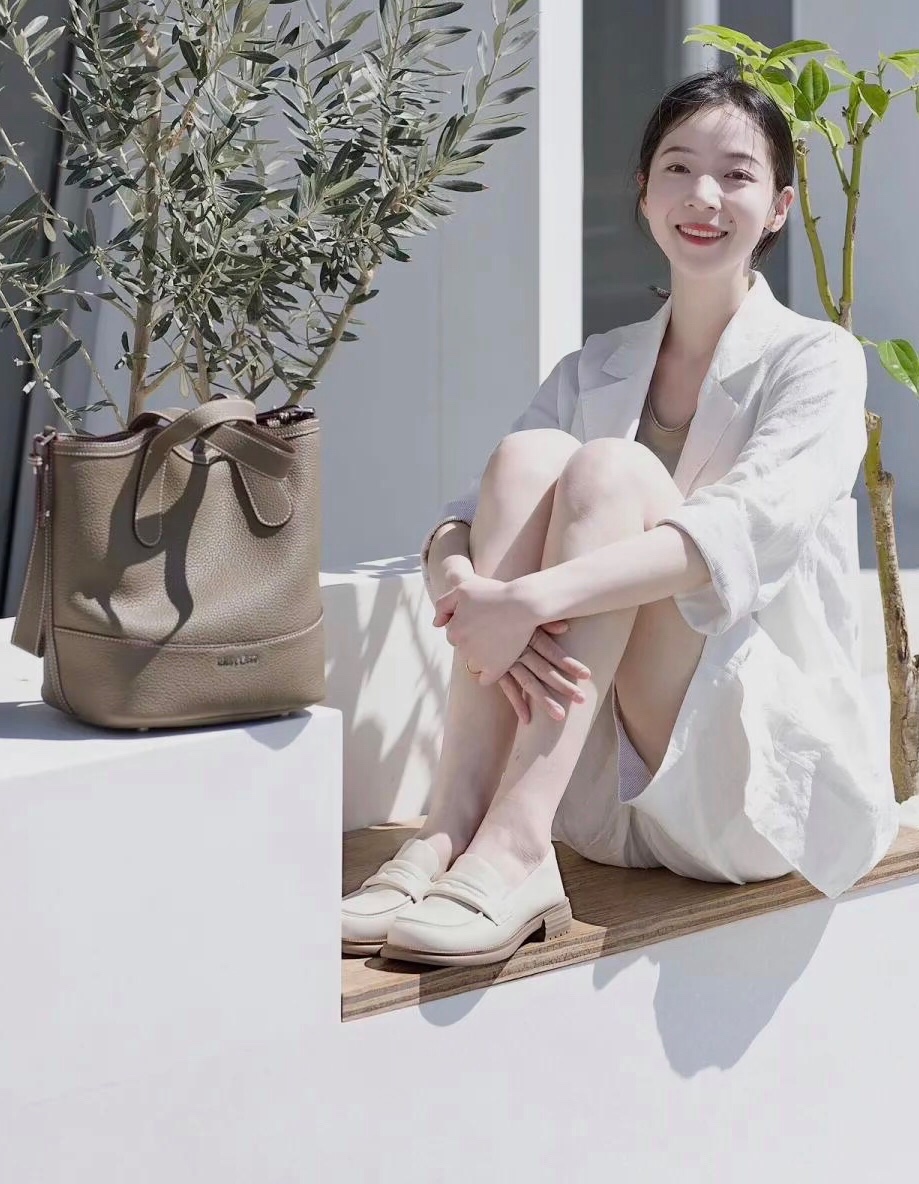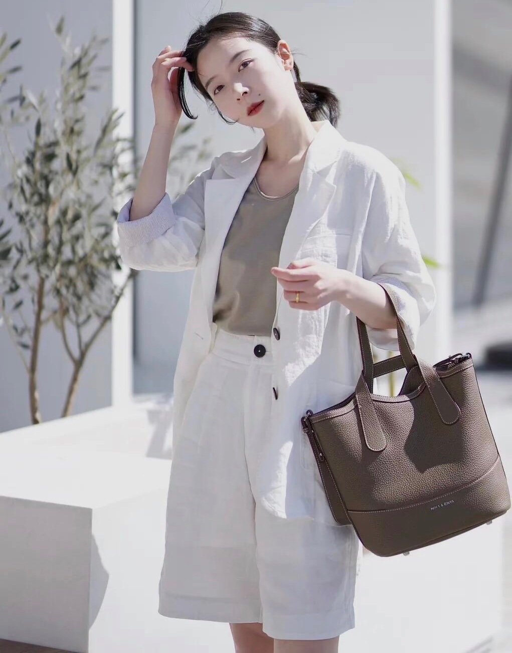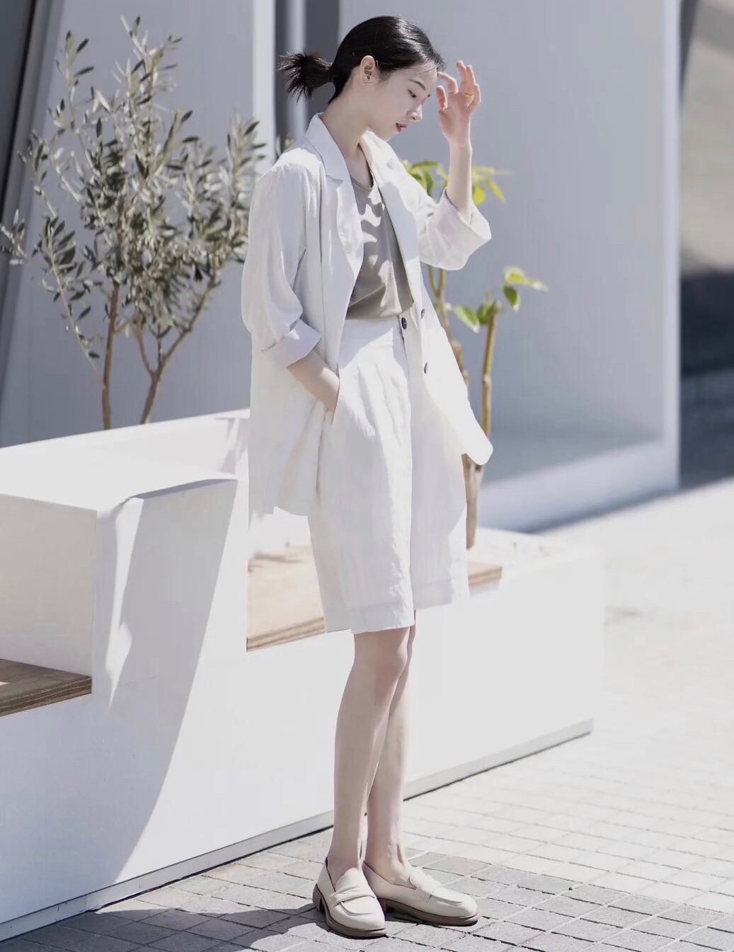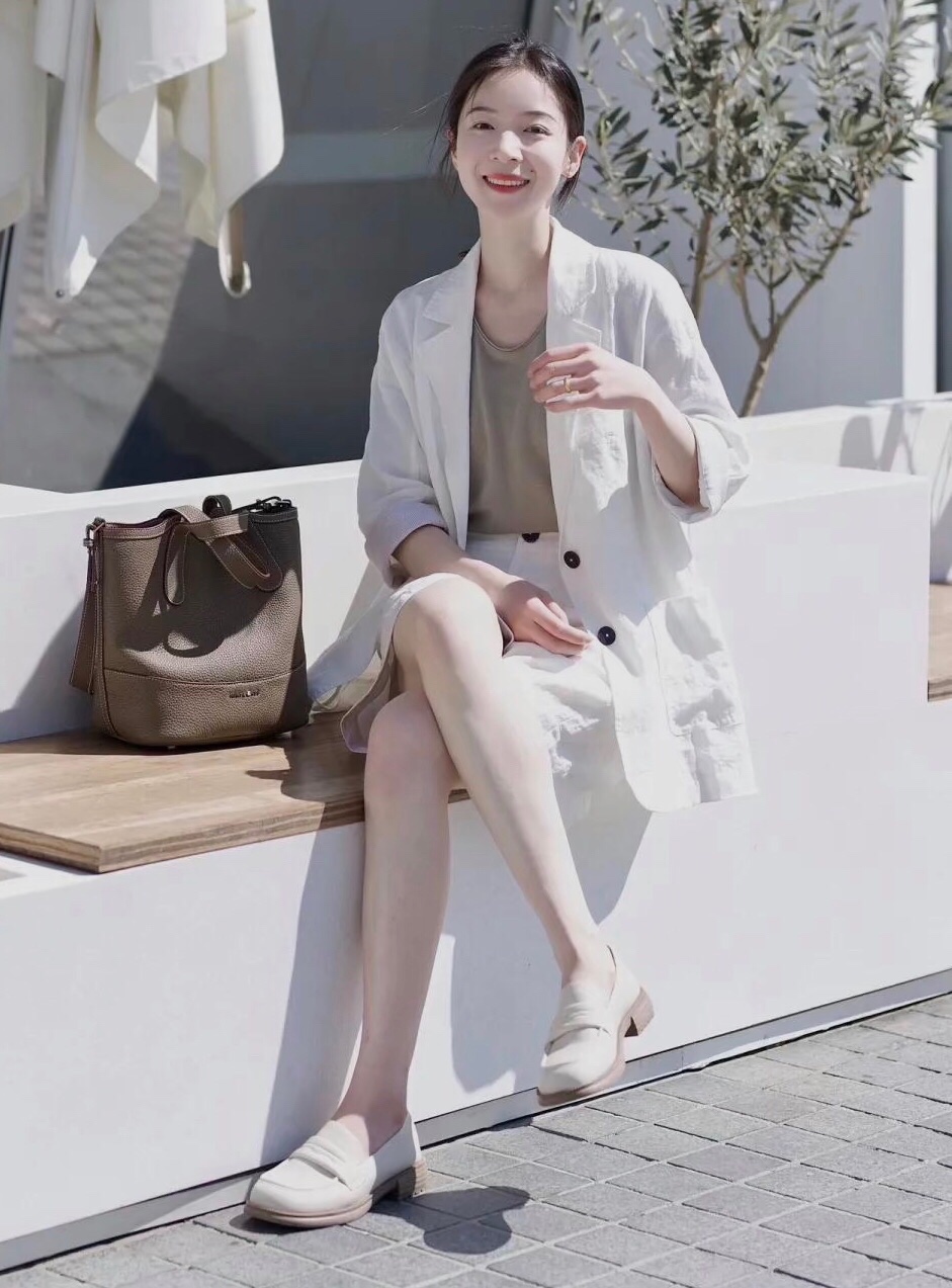 这件白色西装外套搭配短裤,秀出美腿线条,更多的清爽了。