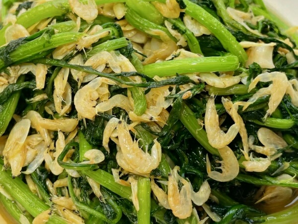 1、虾米清洗干净,茼蒿清洗干净切成小段备用。