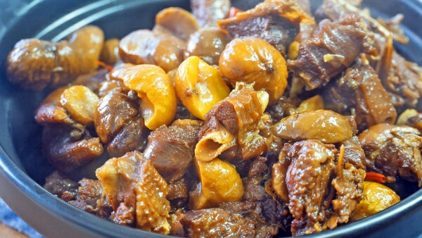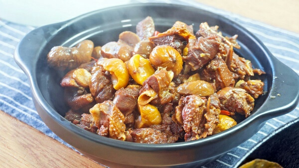 3、炒匀后加开水,水量没过食材就可以了,先用大火煮开,然后转小火慢炖1个半小时,1个半小时大鹅也煮熟了,板栗也煮好了;