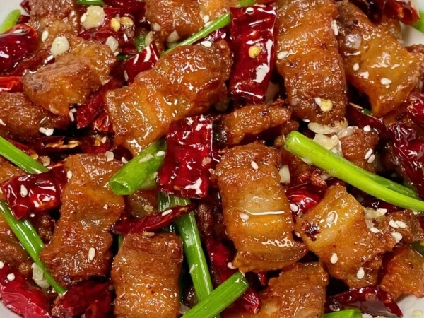 3、锅留底油,放入姜蒜末、花椒粒、干辣椒翻炒出香味,再放入五花肉翻炒均匀。再加入白糖、鸡精、白芝麻和葱段,开大火翻炒几下即可出锅装盘开吃。