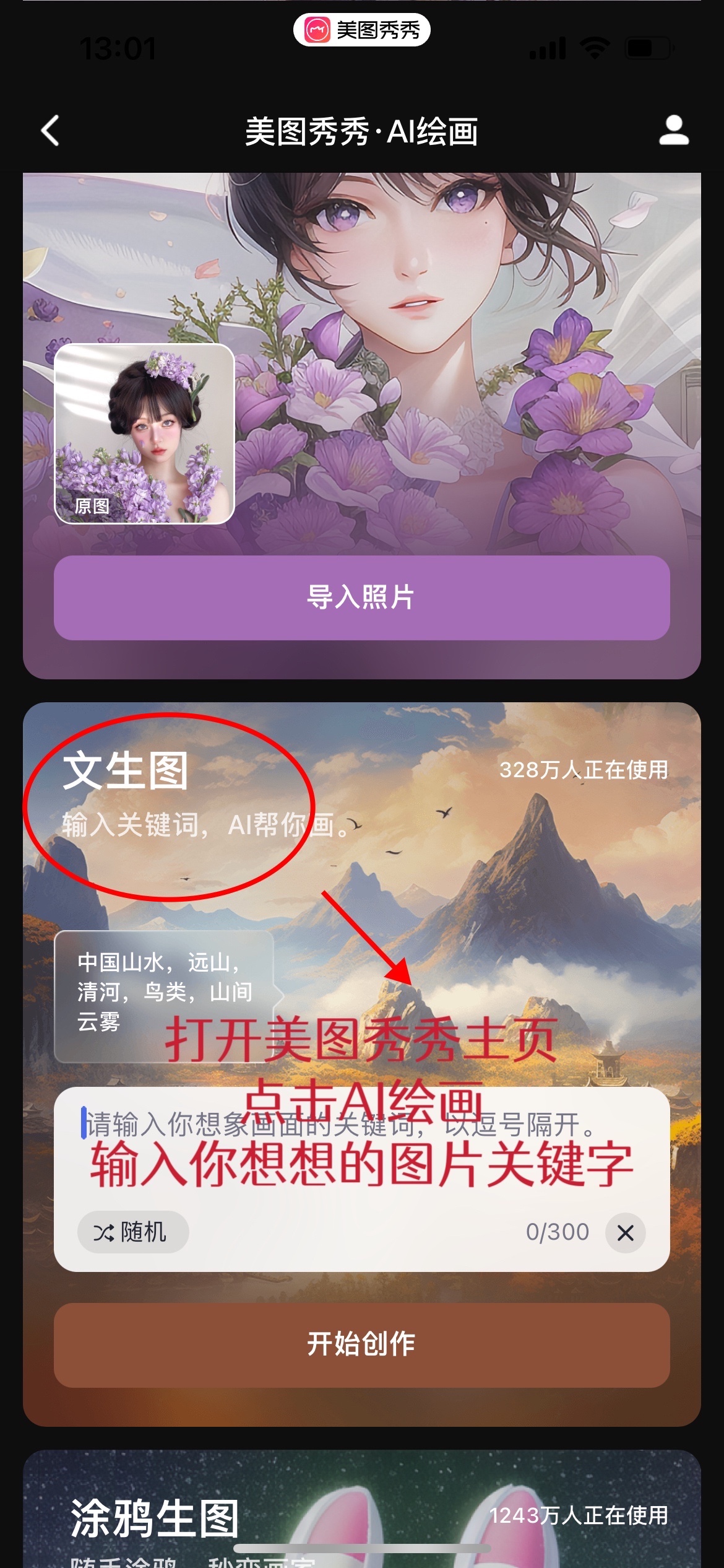💕💕💕💕打开美图秀秀首页-👉AI绘画👉文生图:输入自己想象的图片文字,文字越详细越好,即可生成图片