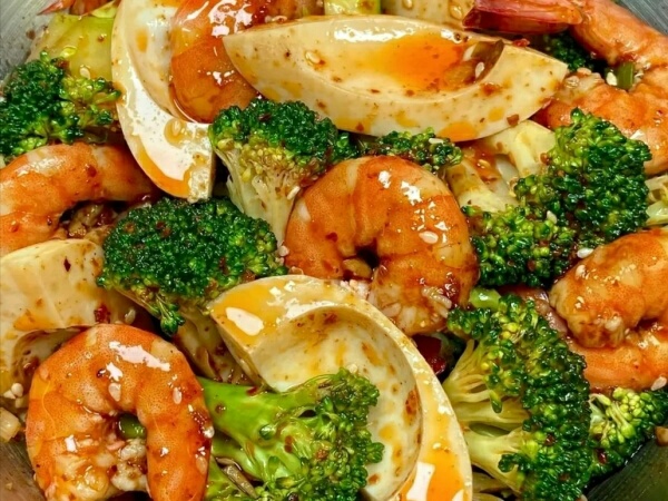 食材准备:西兰花、土鸡蛋、大虾、葱末、蒜末、白芝麻、辣椒面。