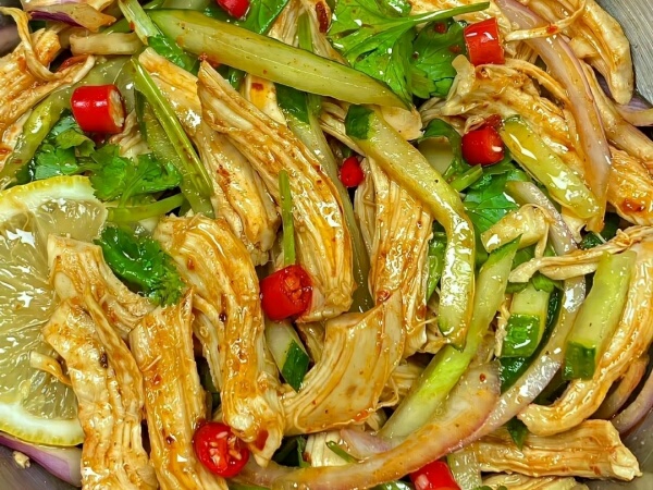 食材准备:鸡胸肉、黄瓜、洋葱、香菜、柠檬、葱姜、蒜末、小米辣、辣椒面。