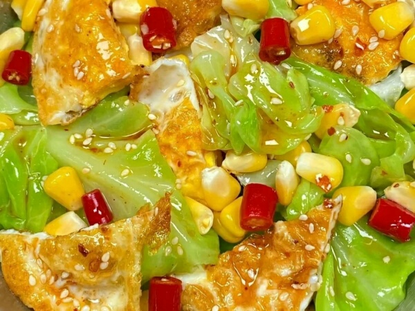 食材准备:包菜、 土鸡蛋、玉米粒、蒜末、小米辣、白芝麻、辣椒面。