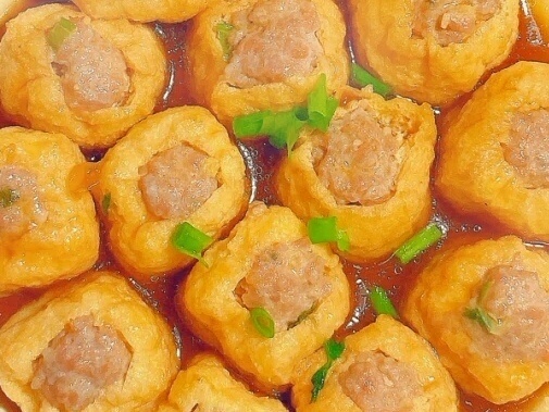 2、油豆腐挖一个洞,塞入肉馅,全部弄好之后摆好盘,冷水上锅蒸15分钟。